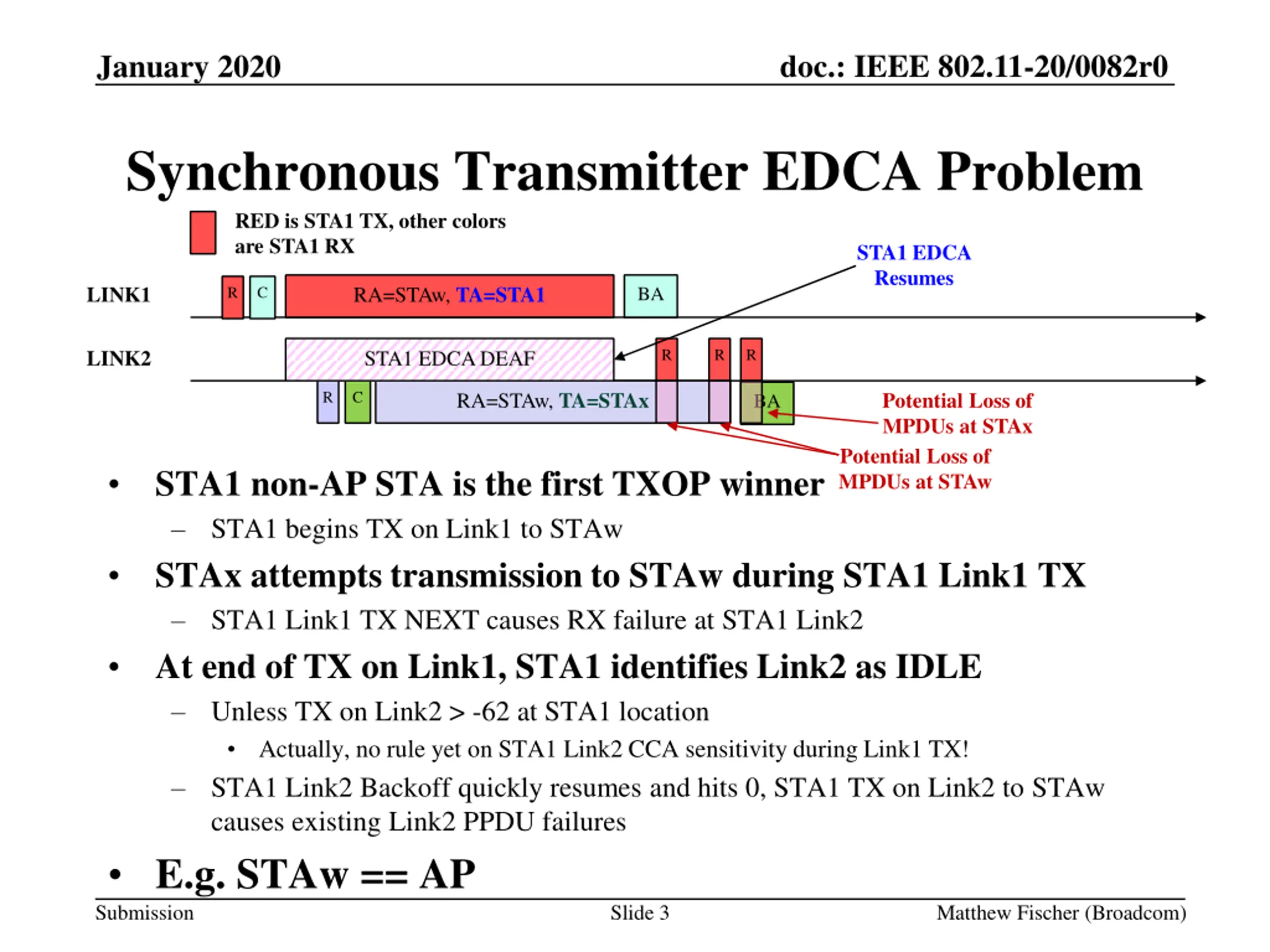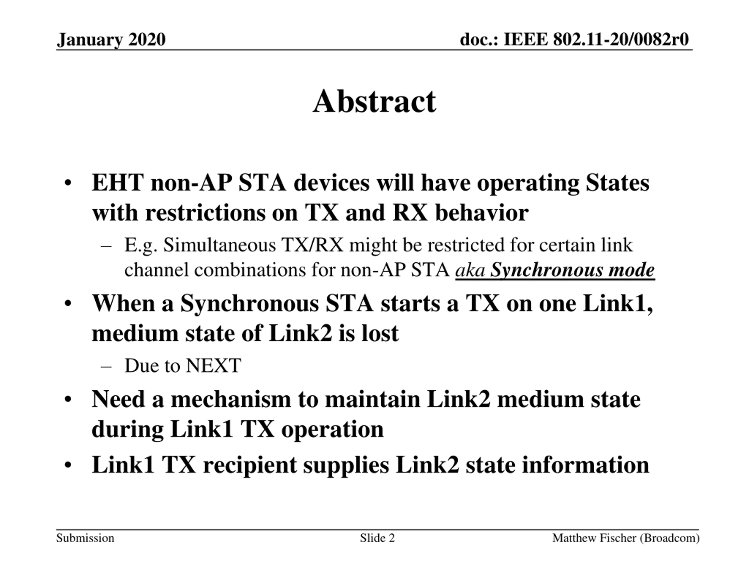 doc.: IEEE 802.11-20/0082r0 January 2020 Abstract EHT non-AP STA devices will have operating States with restrictions on TX and RX behavior E.g. Simultaneous TX/RX might be restricted for certain link channel combinations for non-AP STA aka Synchronous mode When a Synchronous STA starts a TX on one Link1, medium state of Link2 is lost Due to NEXT Need a mechanism to maintain Link2 medium state during Link1 TX operation Link1 TX recipient supplies Link2 state information Submission Slide 2 Matthew Fischer (Broadcom)