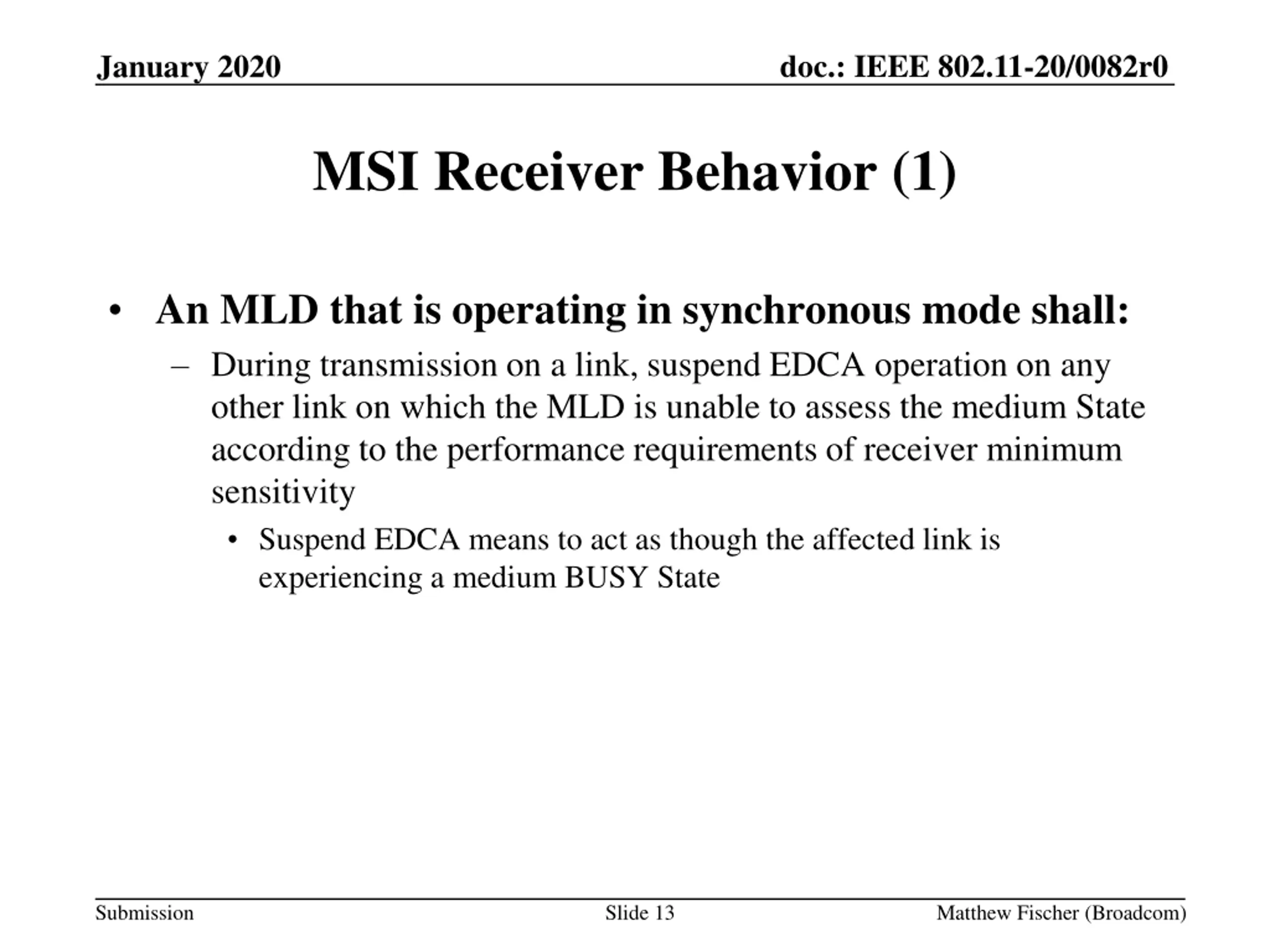 doc.: IEEE 802.11-20/0082r0 January 2020 MSI Receiver Behavior (1) An MLD that is operating in synchronous mode shall: During transmission on a link, suspend EDCA operation on any other link on which the MLD is unable to assess the medium State according to the performance requirements of receiver minimum sensitivity Suspend EDCA means to act as though the affected link is experiencing a medium BUSY State Submission Slide 13 Matthew Fischer (Broadcom)