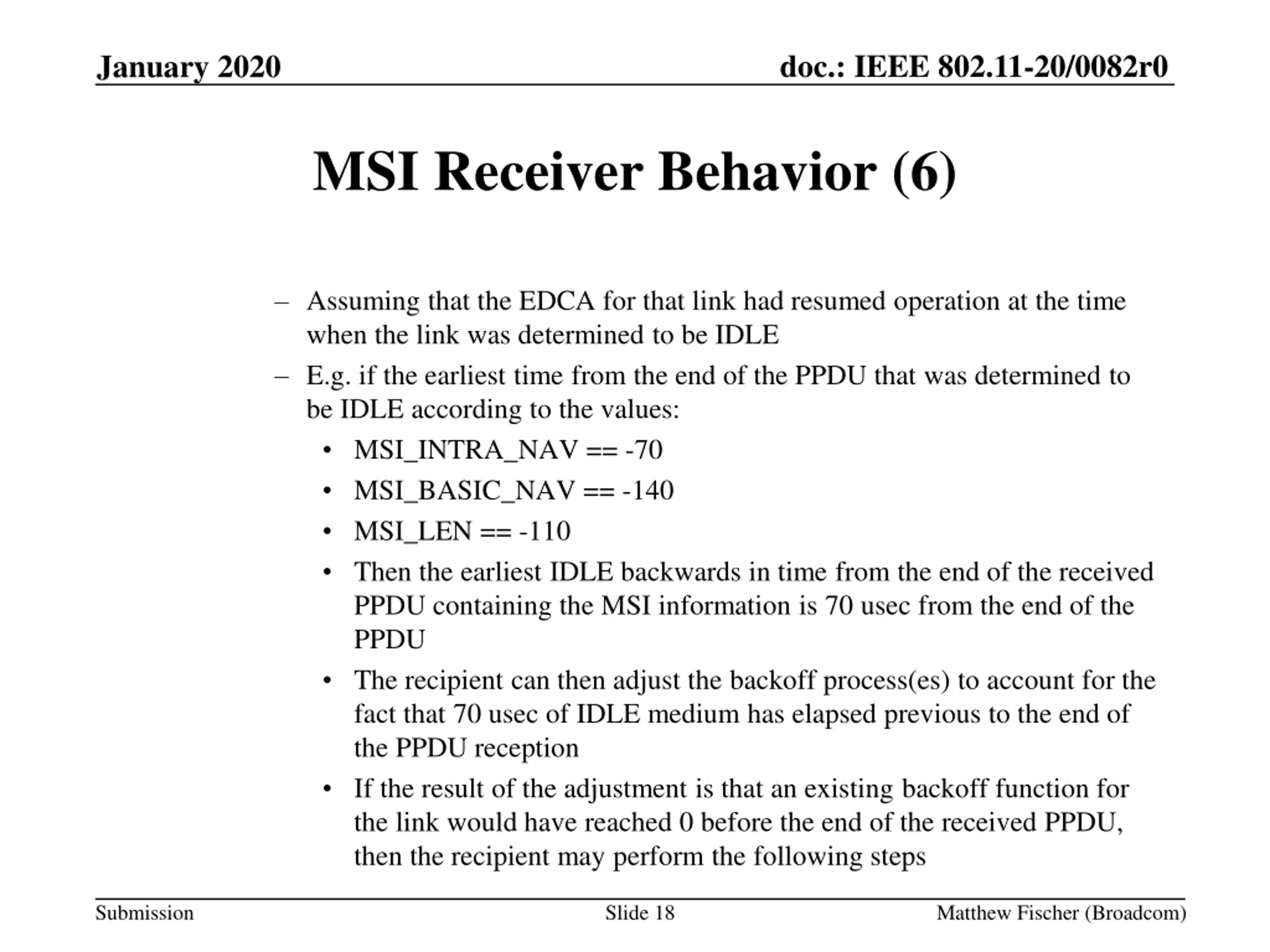 doc.: IEEE 802.11-20/0082r0 January 2020 MSI Receiver Behavior (5) If an MSI parameter for a link is received with a negative value in a PPDU, then The recipient of the MSI may perform an adjustment to its backoff process on the affected link E.g. the backoff should be calculated at the end of the receipt of the PPDU containing the MSI, assuming that the magnitude of the negative value of the parameter is effectively that amount of IDLE time that has passed previous to the end of the PPDU For example, if all MSI parameters indicate either 0 or a negative value, then at the end of the receipt of the PPDU, the recipient determines the earliest time, backwards from the end of the PPDU, at which all parameters had reached zero, representing a sum IDLE indication for the link, and the amount of time from that point forward in time to the end of the PPDU is an amount of time considered IDLE for that link which can be used to determine the current state of the EDCA for that link, Submission Slide 17 Matthew Fischer (Broadcom)