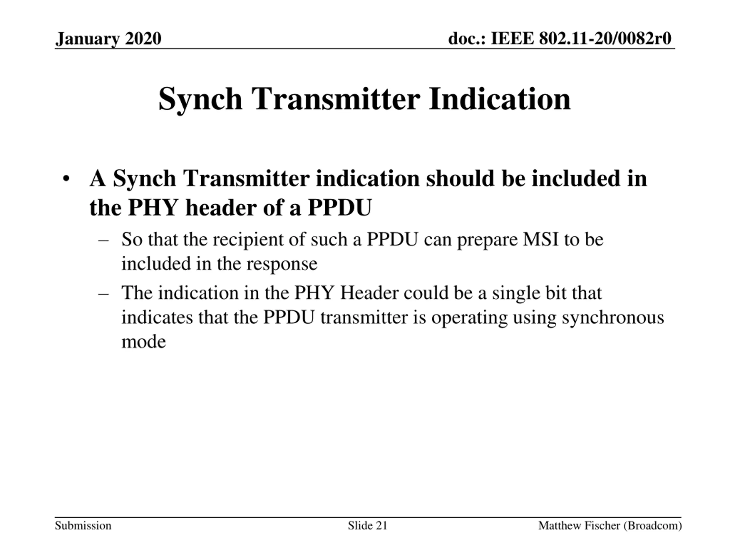 doc.: IEEE 802.11-20/0082r0 January 2020 Synch Transmitter Indication A Synch Transmitter indication should be included in the PHY header of a PPDU So that the recipient of such a PPDU can prepare MSI to be included in the response The indication in the PHY Header could be a single bit that indicates that the PPDU transmitter is operating using synchronous mode Submission Slide 21 Matthew Fischer (Broadcom)
