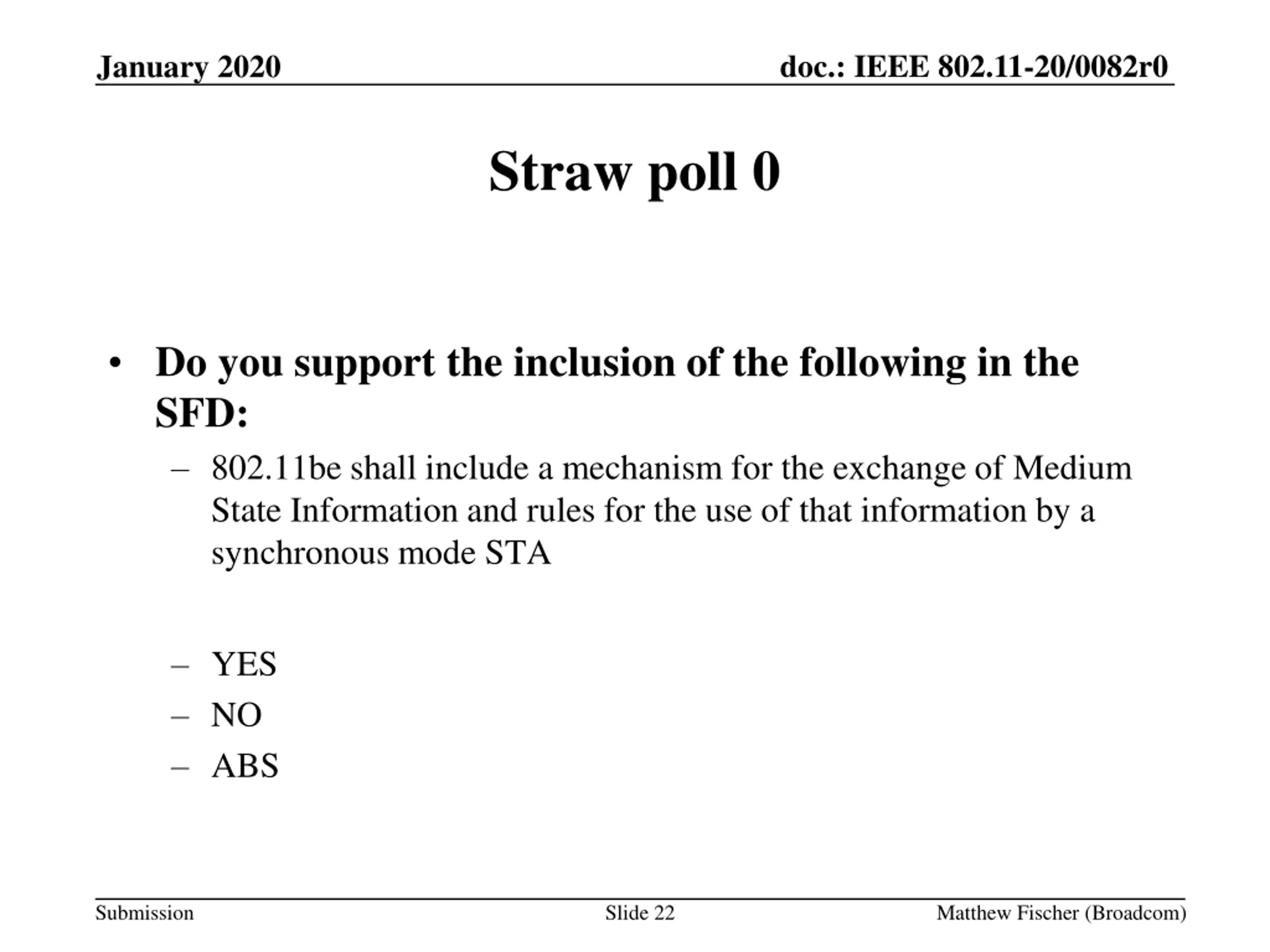 doc.: IEEE 802.11-20/0082r0 January 2020 Straw poll 0 Do you support the inclusion of the following in the SFD: 802.11be shall include a mechanism for the exchange of Medium State Information and rules for the use of that information by a synchronous mode STA YES NO ABS Submission Slide 22 Matthew Fischer (Broadcom)