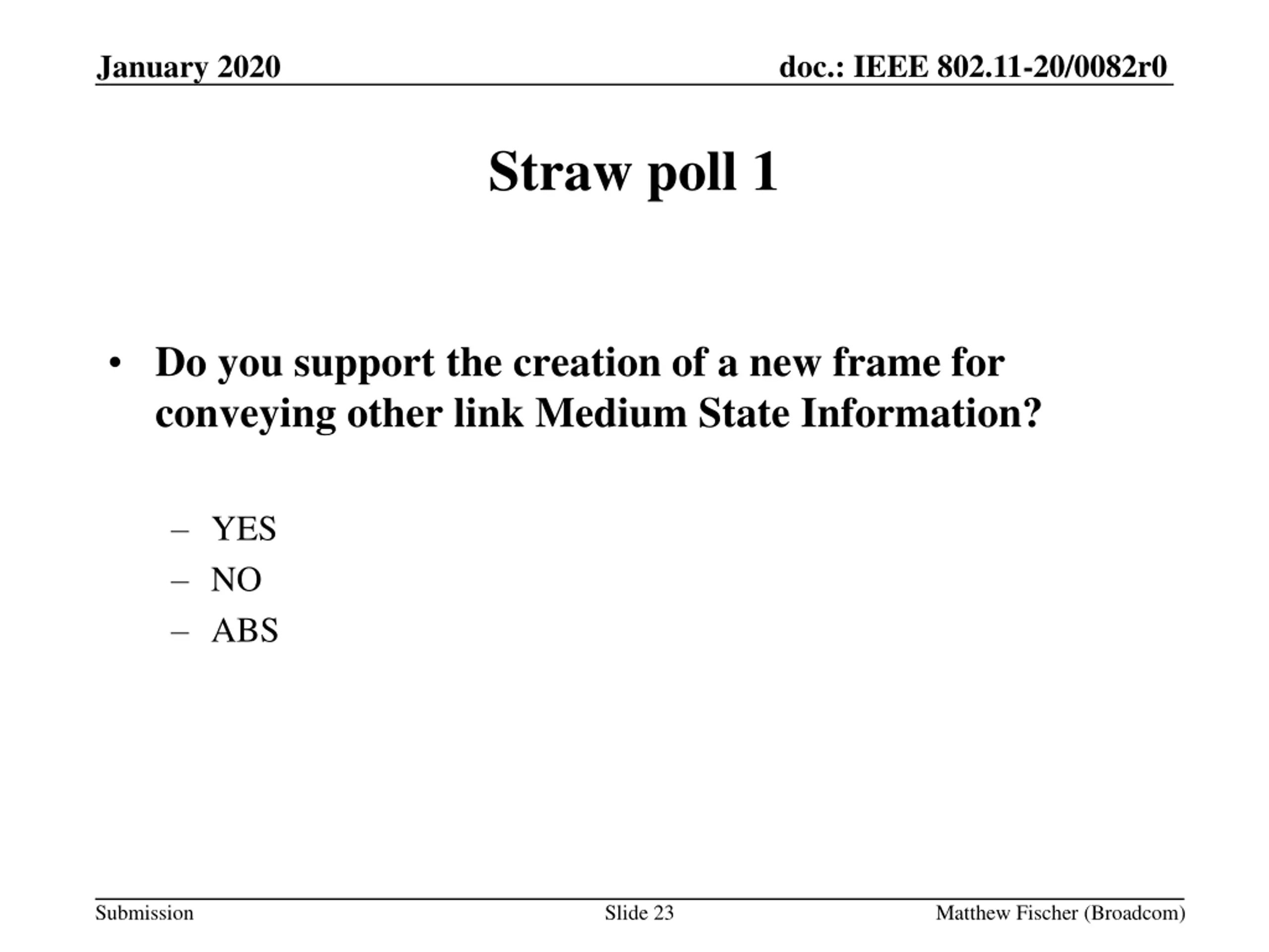 doc.: IEEE 802.11-20/0082r0 January 2020 Straw poll 1 Do you support the creation of a new frame for conveying other link Medium State Information? YES NO ABS Submission Slide 23 Matthew Fischer (Broadcom)