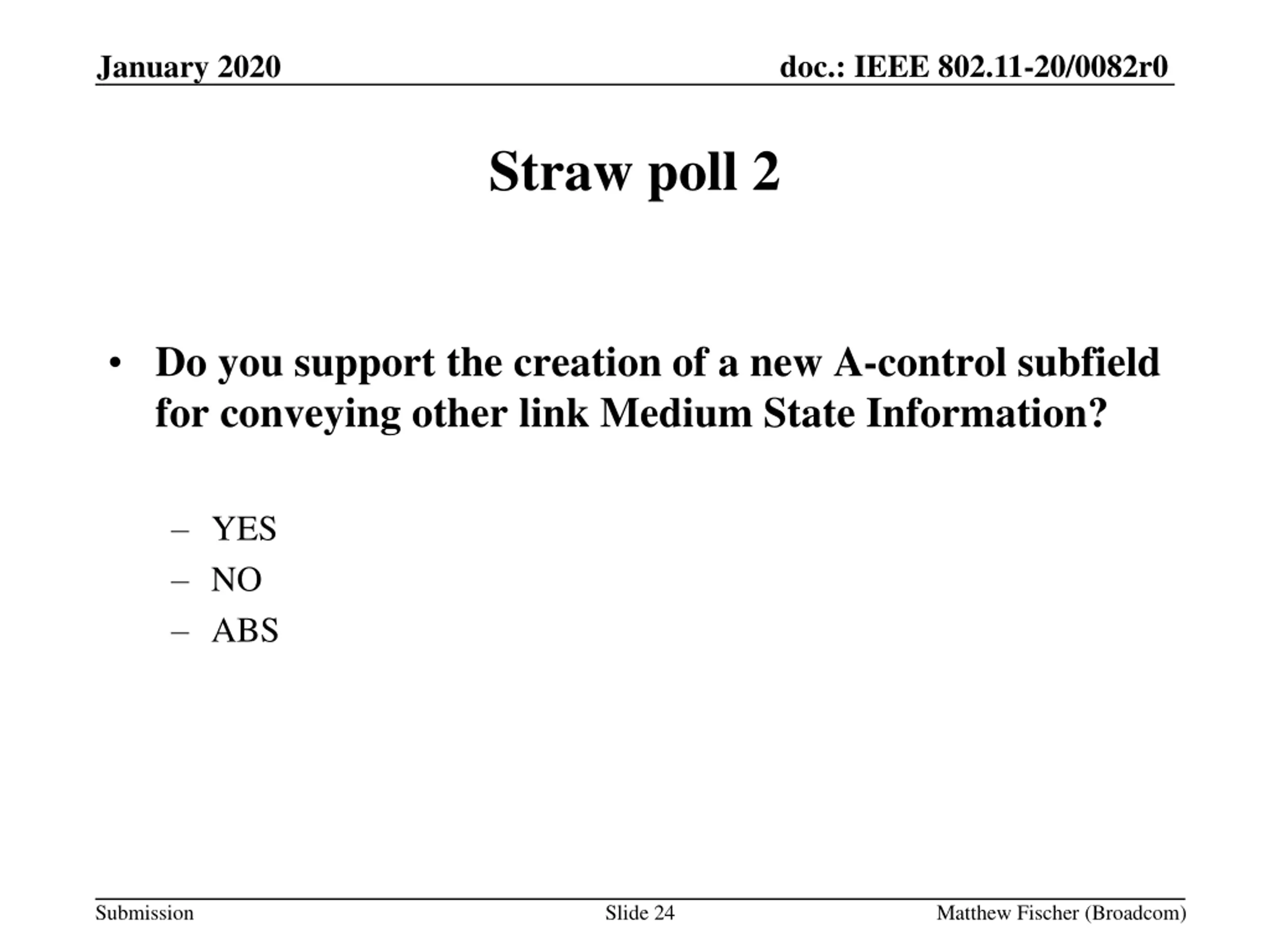 doc.: IEEE 802.11-20/0082r0 January 2020 Straw poll 2 Do you support the creation of a new A-control subfield for conveying other link Medium State Information? YES NO ABS Submission Slide 24 Matthew Fischer (Broadcom)
