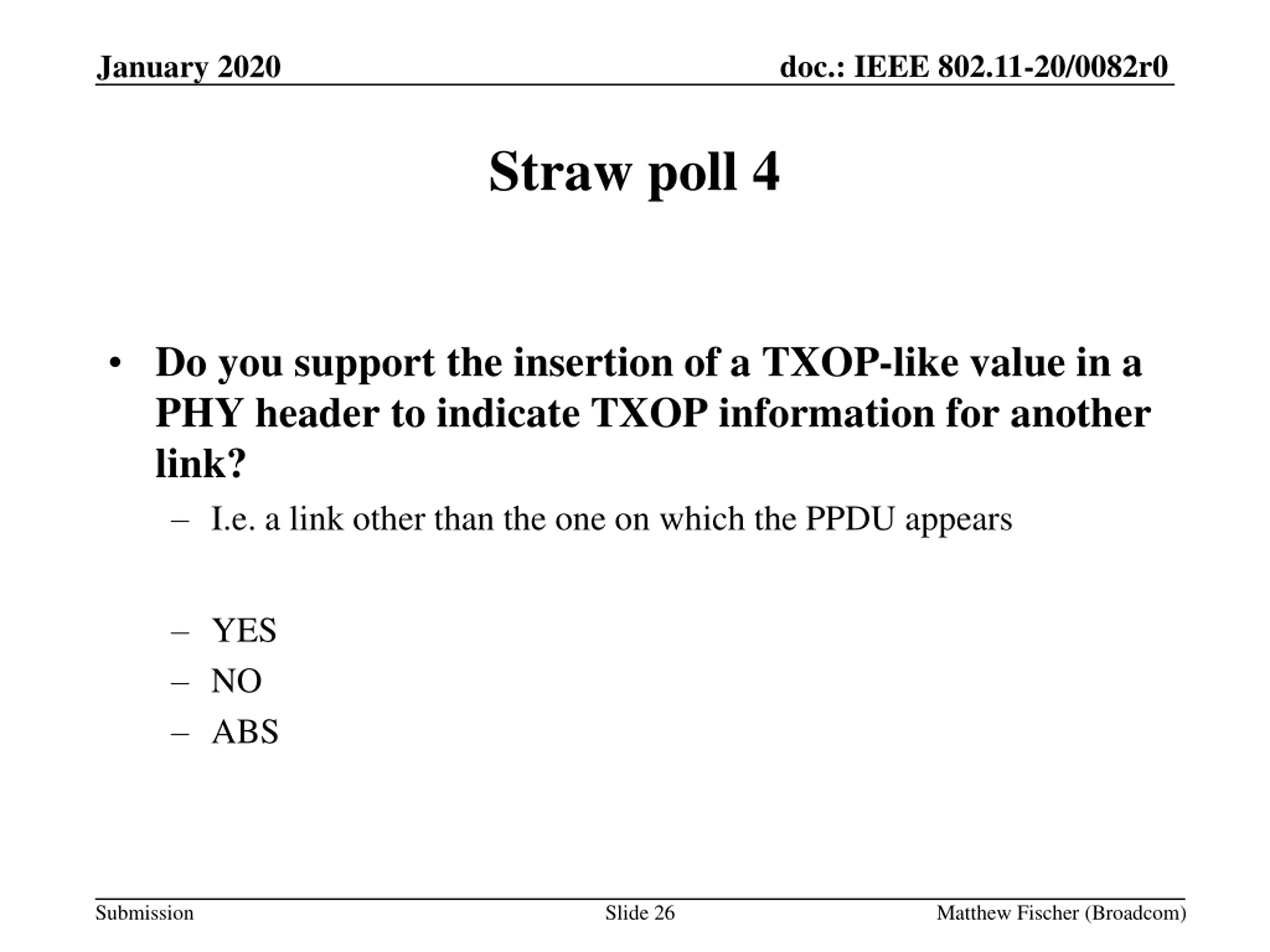 doc.: IEEE 802.11-20/0082r0 January 2020 Straw poll 4 Do you support the insertion of a TXOP-like value in a PHY header to indicate TXOP information for another link? I.e. a link other than the one on which the PPDU appears YES NO ABS Submission Slide 26 Matthew Fischer (Broadcom)
