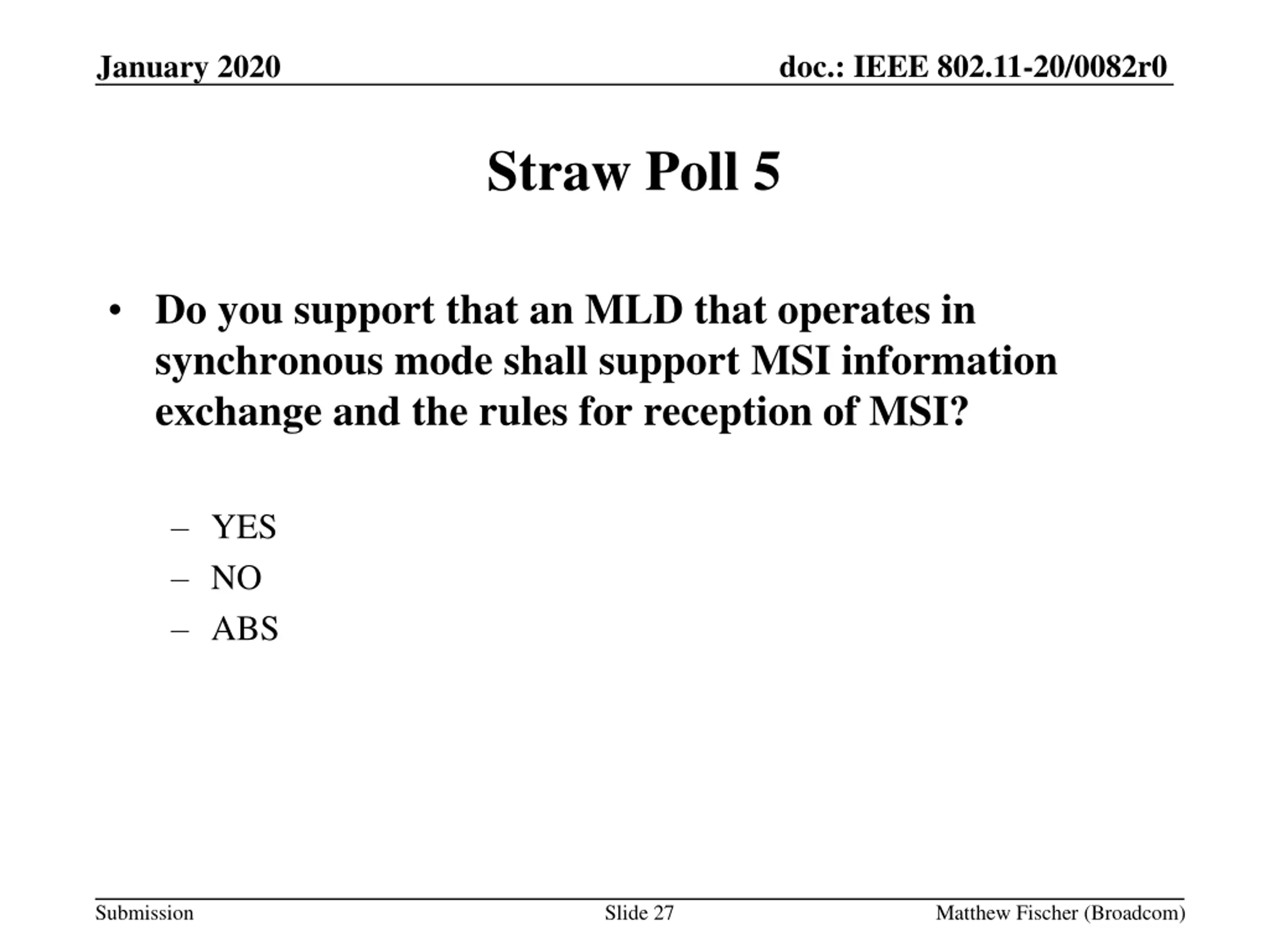 doc.: IEEE 802.11-20/0082r0 January 2020 Straw Poll 5 Do you support that an MLD that operates in synchronous mode shall support MSI information exchange and the rules for reception of MSI? YES NO ABS Submission Slide 27 Matthew Fischer (Broadcom)