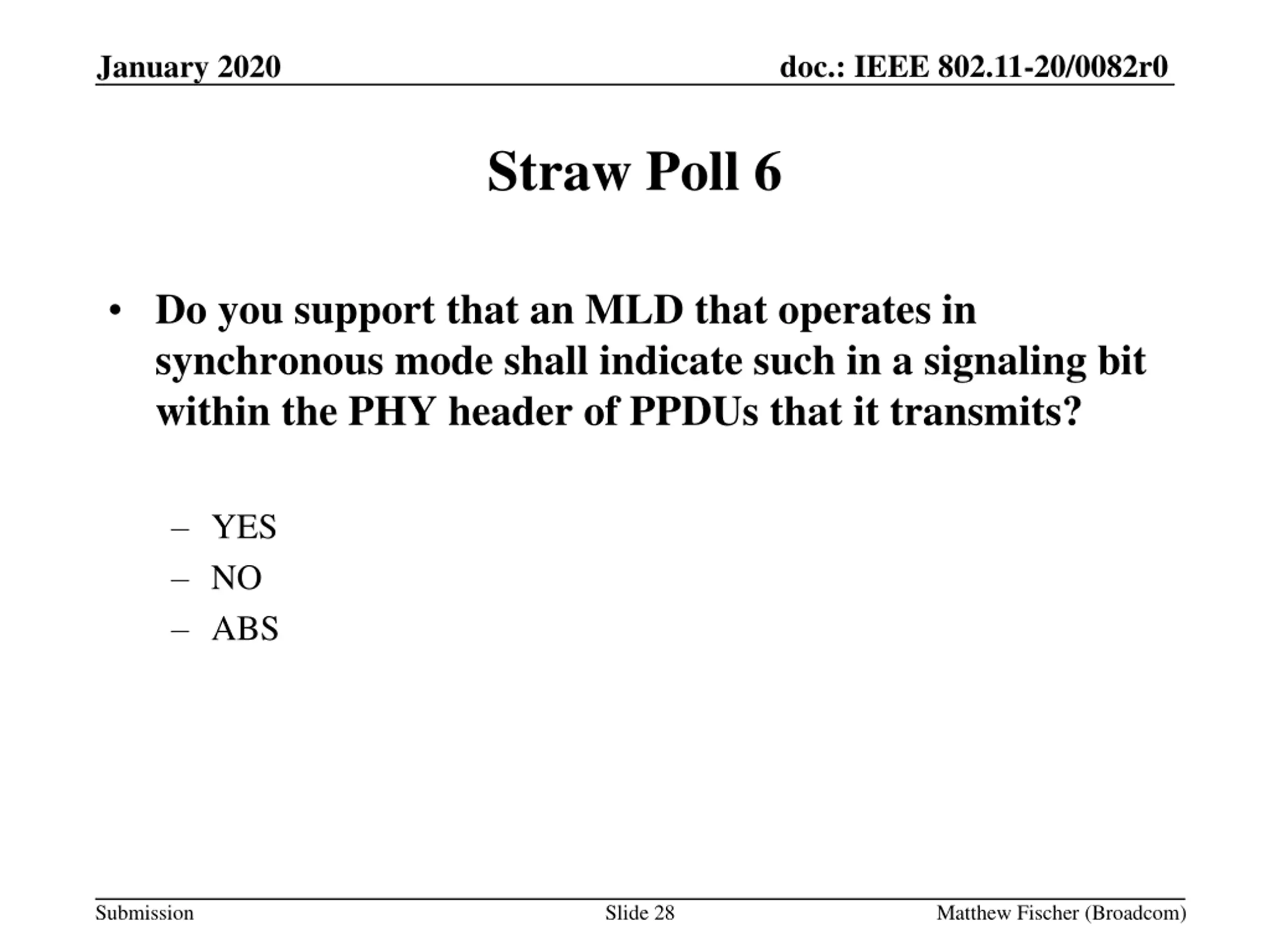 doc.: IEEE 802.11-20/0082r0 January 2020 Straw Poll 6 Do you support that an MLD that operates in synchronous mode shall indicate such in a signaling bit within the PHY header of PPDUs that it transmits? YES NO ABS Submission Slide 28 Matthew Fischer (Broadcom)