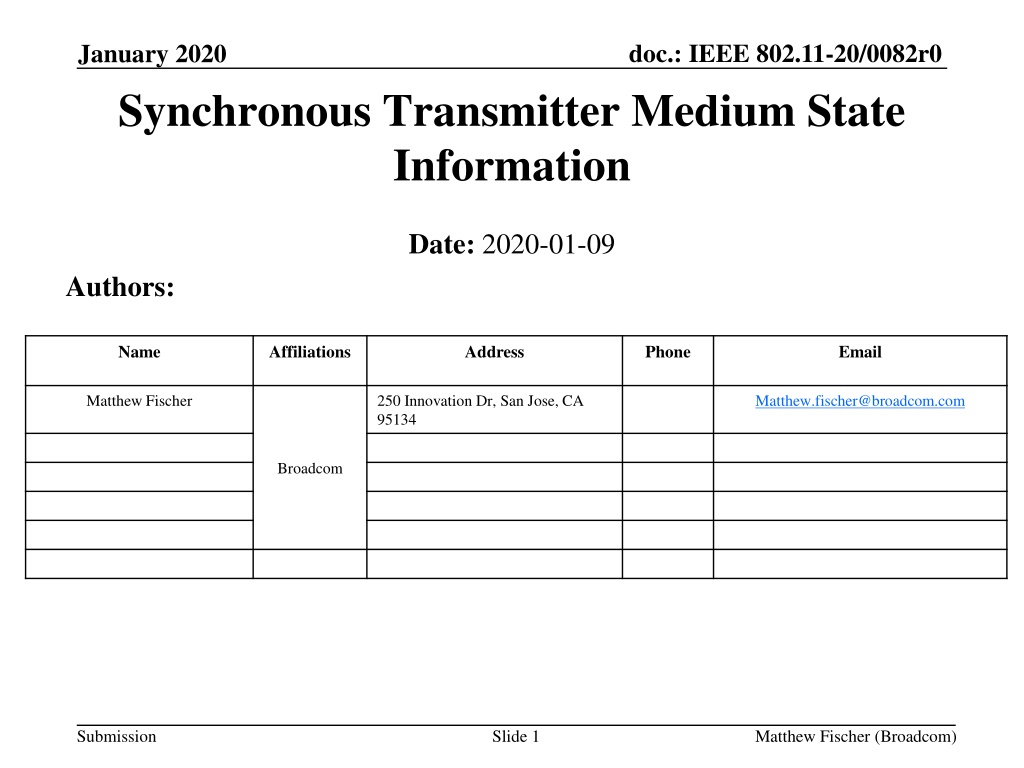 doc.: IEEE 802.11-20/0082r0 January 2020 Synchronous Transmitter Medium State Information Date: 2020-01-09 Authors: Name Affiliations Address Phone Email Matthew Fischer 250 Innovation Dr, San Jose, CA 95134 Matthew.fischer@broadcom.com Broadcom Submission Slide 1 Matthew Fischer (Broadcom)