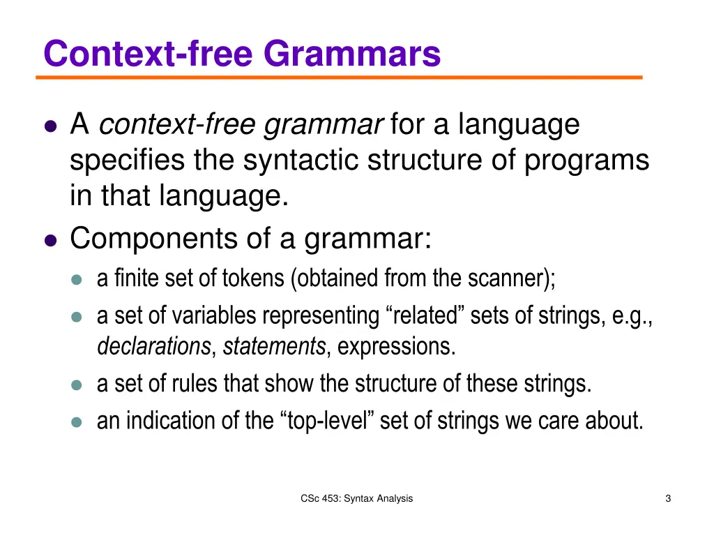 Context-free Grammars A context-free grammar for a language specifies the syntactic structure of programs in that language. Components of a grammar: a finite set of tokens (obtained from the scanner); a set of variables representing related sets of strings, e.g., declarations, statements, expressions. a set of rules that show the structure of these strings. an indication of the top-level set of strings we care about. CSc 453: Syntax Analysis 3