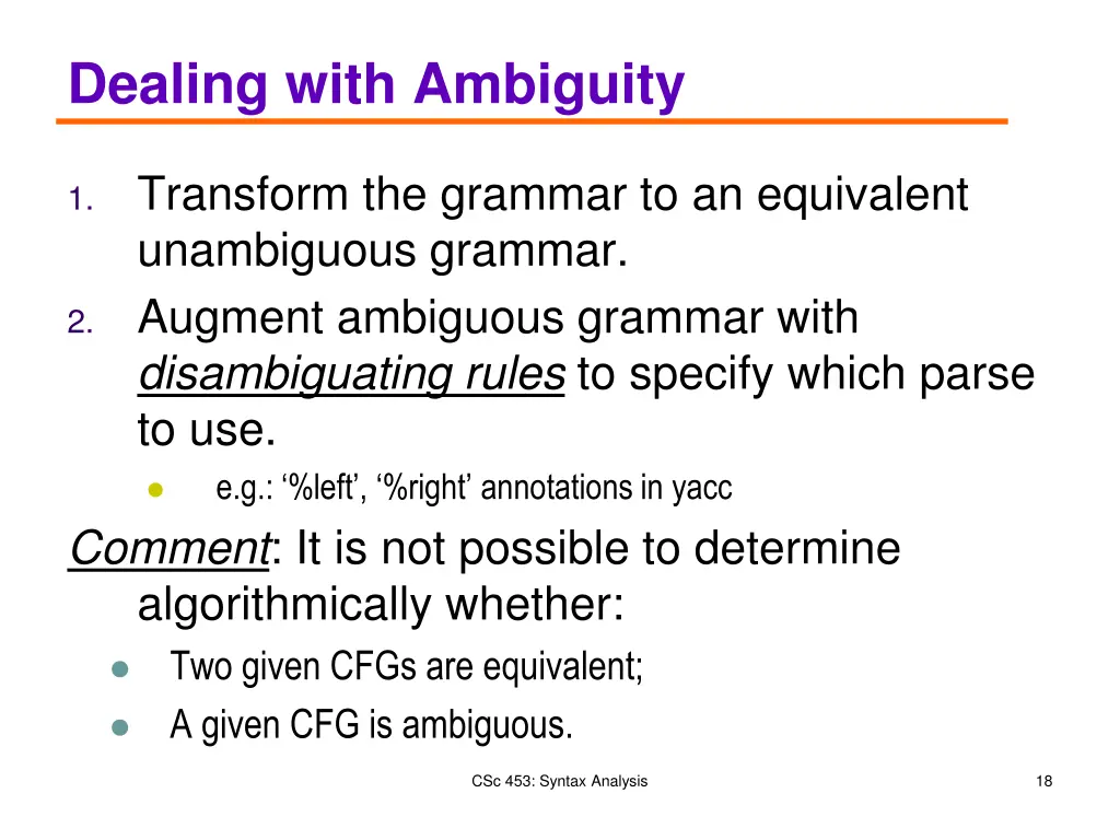 Dealing with Ambiguity Transform the grammar to an equivalent unambiguous grammar. Augment ambiguous grammar with disambiguating rules to specify which parse to use. e.g.: %left , %right annotations in yacc Comment: It is not possible to determine algorithmically whether: Two given CFGs are equivalent; A given CFG is ambiguous. 1. 2. CSc 453: Syntax Analysis 18