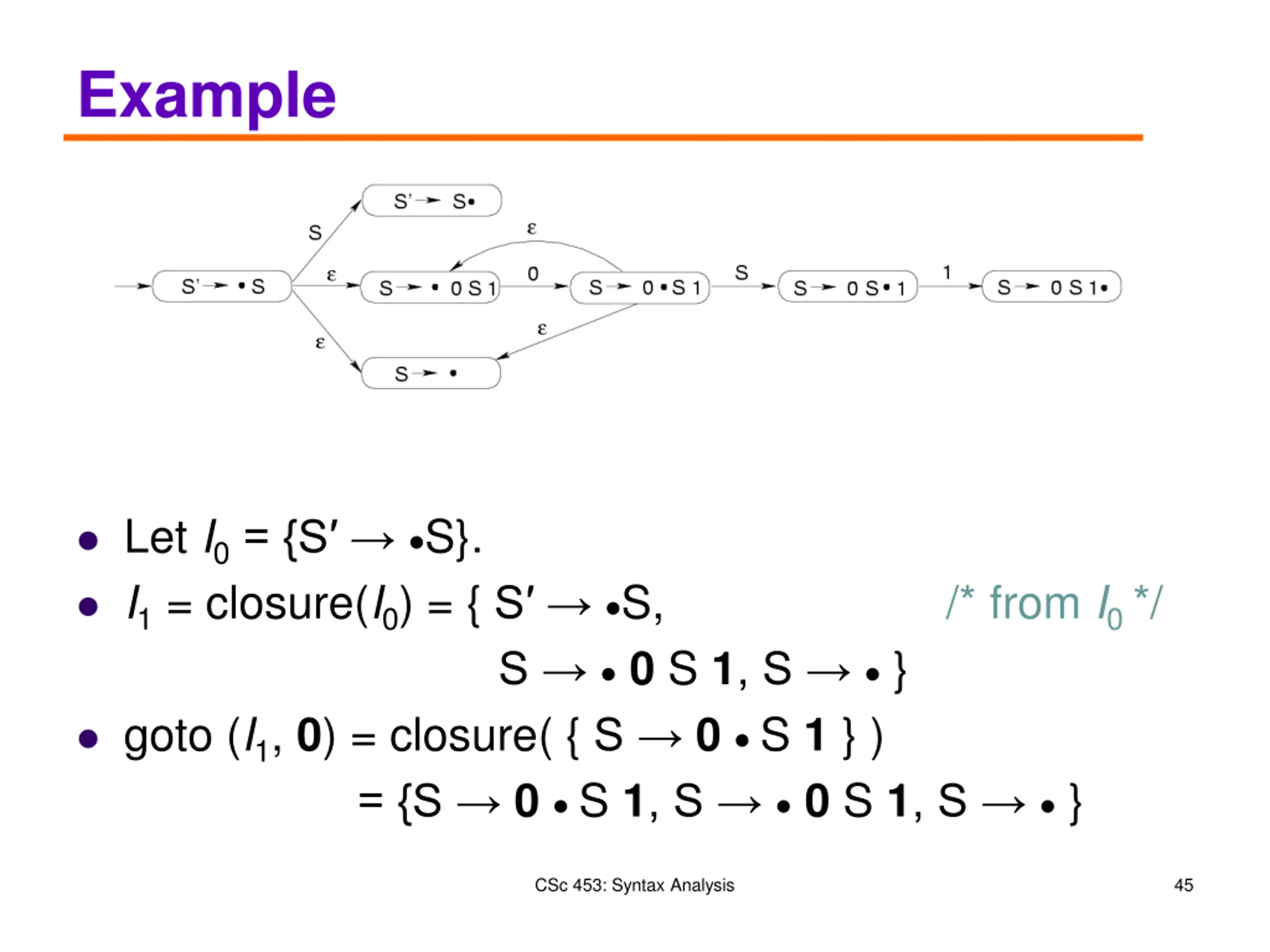 Example Let I0= {S S}. I1 = closure(I0) = { S S, /* from I0 */ S 0 S 1, S } goto (I1, 0) = closure( { S 0 S 1 } ) = {S 0 S 1, S 0 S 1, S } CSc 453: Syntax Analysis 45