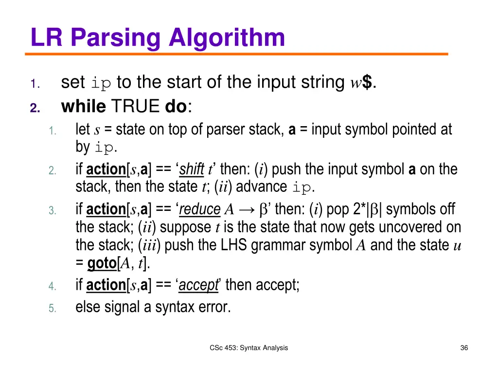 LR Parsing Algorithm setipto the start of the input string w$. while TRUE do: let s = state on top of parser stack, a = input symbol pointed at by ip. if action[s,a] == shiftt then: (i) push the input symbol a on the stack, then the state t; (ii) advance ip. if action[s,a] == reduceA then: (i) pop 2*| | symbols off the stack; (ii) suppose t is the state that now gets uncovered on the stack; (iii) push the LHS grammar symbol A and the state u = goto[A, t]. if action[s,a] == accept then accept; else signal a syntax error. 1. 2. 1. 2. 3. 4. 5. CSc 453: Syntax Analysis 36