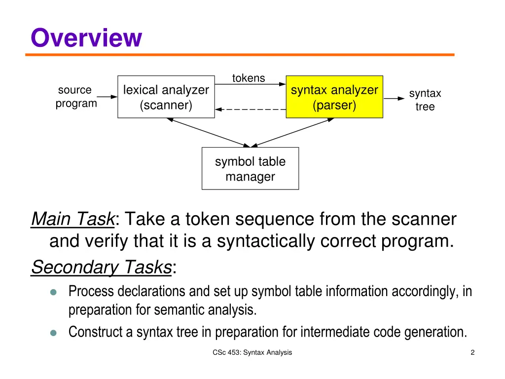 Overview tokens lexical analyzer (scanner) syntax analyzer (parser) source program syntax tree symbol table manager Main Task: Take a token sequence from the scanner and verify that it is a syntactically correct program. Secondary Tasks: Process declarations and set up symbol table information accordingly, in preparation for semantic analysis. Construct a syntax tree in preparation for intermediate code generation. CSc 453: Syntax Analysis 2