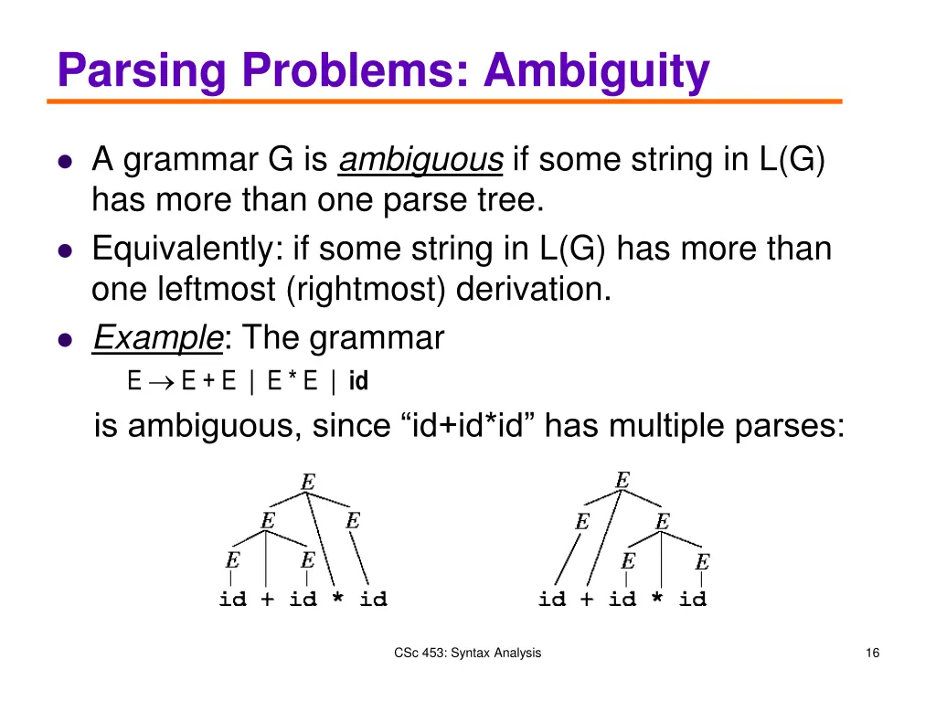 Parsing Problems: Ambiguity A grammar G is ambiguous if some string in L(G) has more than one parse tree. Equivalently: if some string in L(G) has more than one leftmost (rightmost) derivation. Example: The grammar E E + E | E * E | id is ambiguous, since id+id*id has multiple parses: CSc 453: Syntax Analysis 16