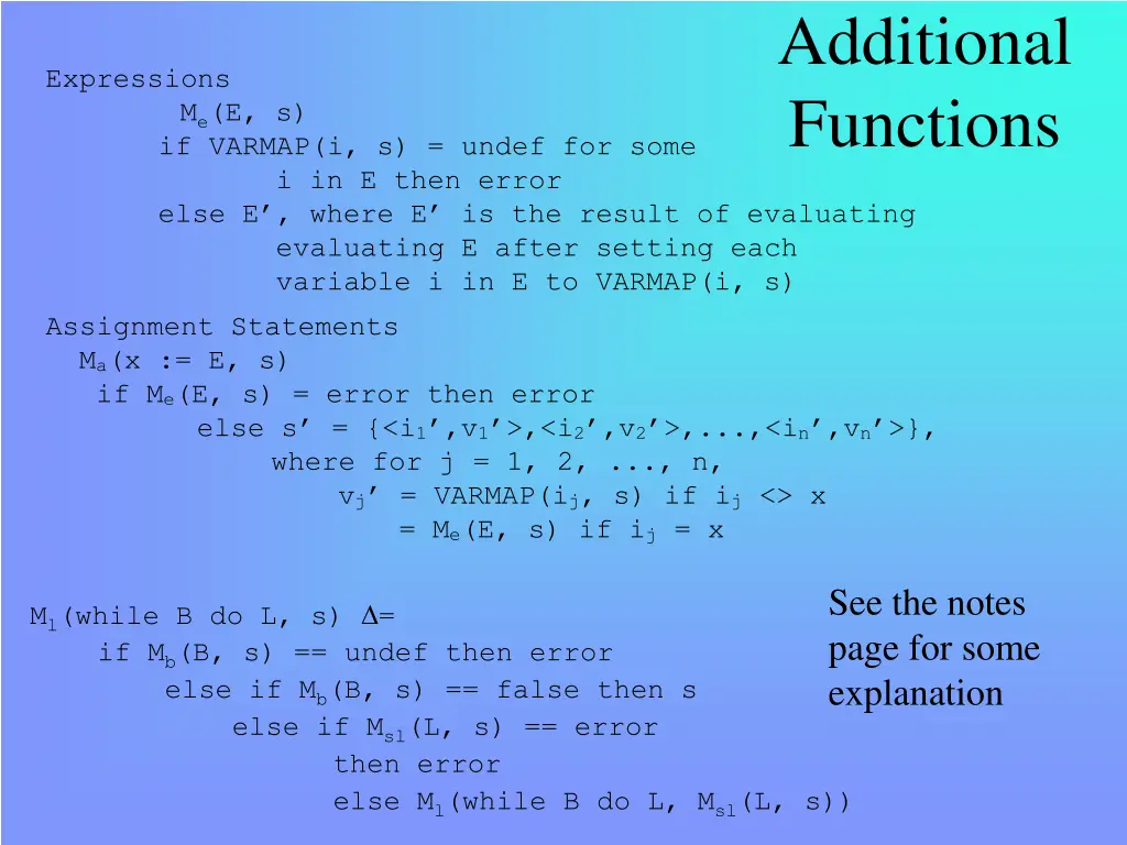 Additional Functions Expressions Me(E, s) if VARMAP(i, s) = undef for some i in E then error else E , where E is the result of evaluating evaluating E after setting each variable i in E to VARMAP(i, s) Assignment Statements Ma(x := E, s) if Me(E, s) = error then error else s = {<i1 ,v1 >,<i2 ,v2 >,...,<in ,vn >}, where for j = 1, 2, ..., n, vj = VARMAP(ij, s) if ij <> x = Me(E, s) if ij = x See the notes page for some explanation Ml(while B do L, s) = if Mb(B, s) == undef then error else if Mb(B, s) == false then s else if Msl(L, s) == error then error else Ml(while B do L, Msl(L, s))