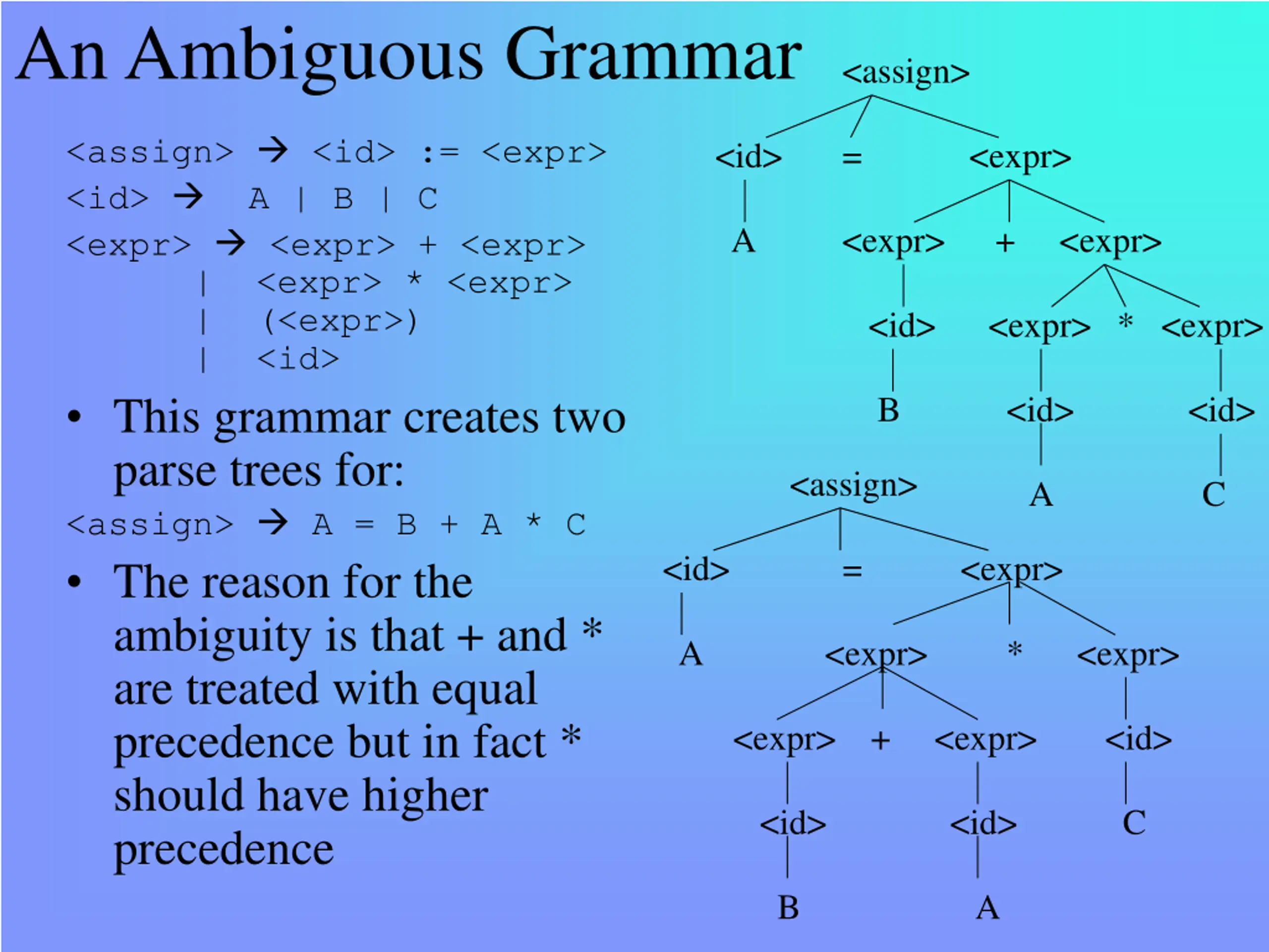 An Ambiguous Grammar <assign> <assign> <id> := <expr> <id> A | B | C <expr> <expr> + <expr> | <expr> * <expr> | (<expr>) | <id> This grammar creates two parse trees for: <assign> A = B + A * C The reason for the ambiguity is that + and * are treated with equal precedence but in fact * should have higher precedence <id> = <expr> A <expr> + <expr> <id> <expr> * <expr> B <id> <id> <assign> A C <id> = <expr> A <expr> * <expr> <expr> + <expr> <id> <id> <id> C B A