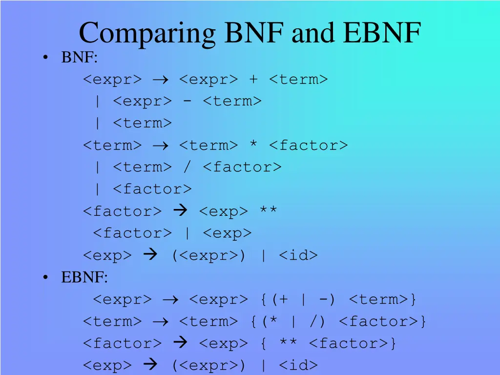Comparing BNF and EBNF BNF: <expr> <expr> + <term> | <expr> - <term> | <term> <term> <term> * <factor> | <term> / <factor> | <factor> <factor> <exp> ** <factor> | <exp> <exp> (<expr>) | <id> EBNF: <expr> <expr> {(+ | -) <term>} <term> <term> {(* | /) <factor>} <factor> <exp> { ** <factor>} <exp> (<expr>) | <id>