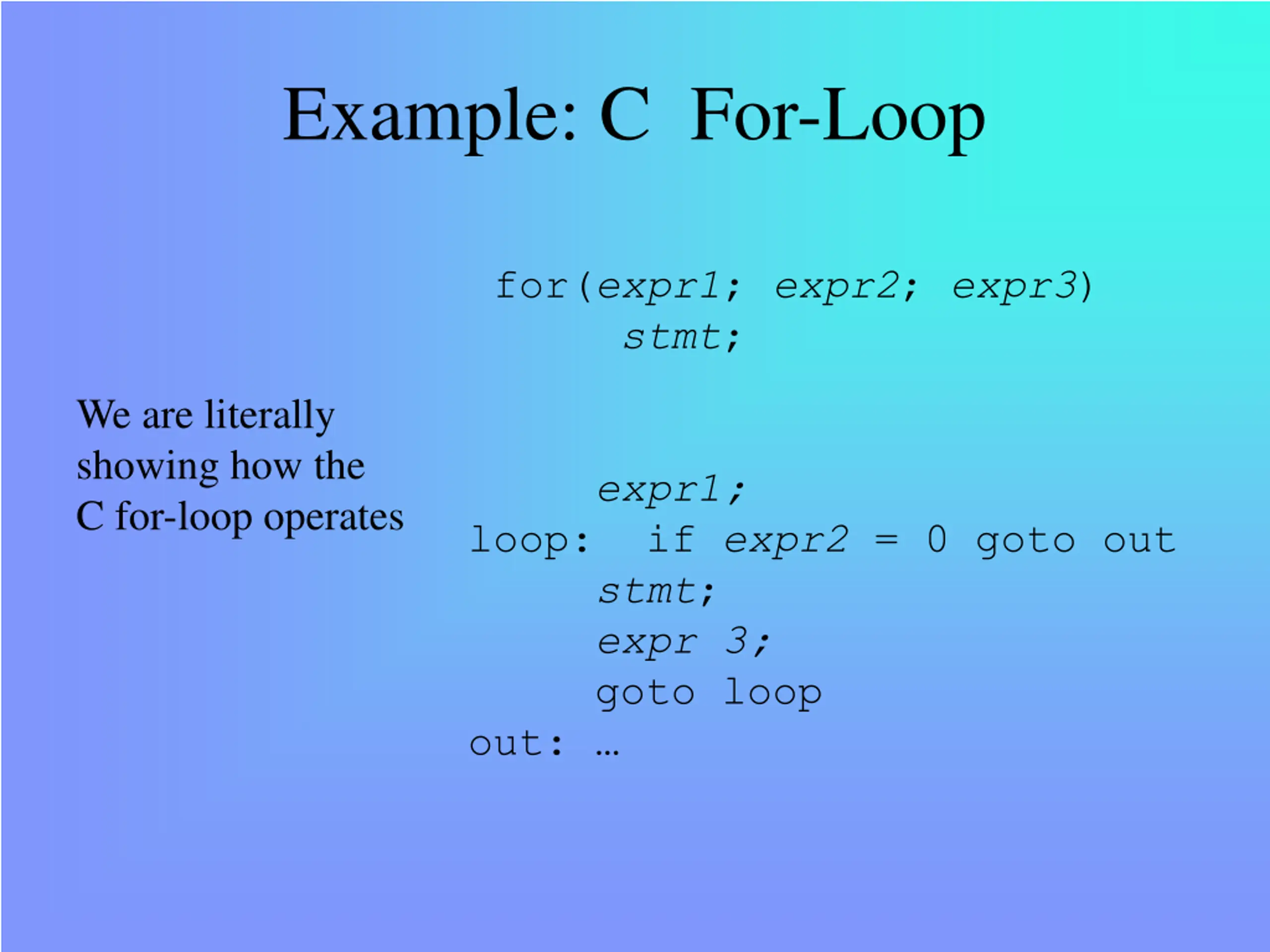 Example: C For-Loop for(expr1; expr2; expr3) stmt; We are literally showing how the C for-loop operates expr1; loop: if expr2 = 0 goto out stmt; expr 3; goto loop out: