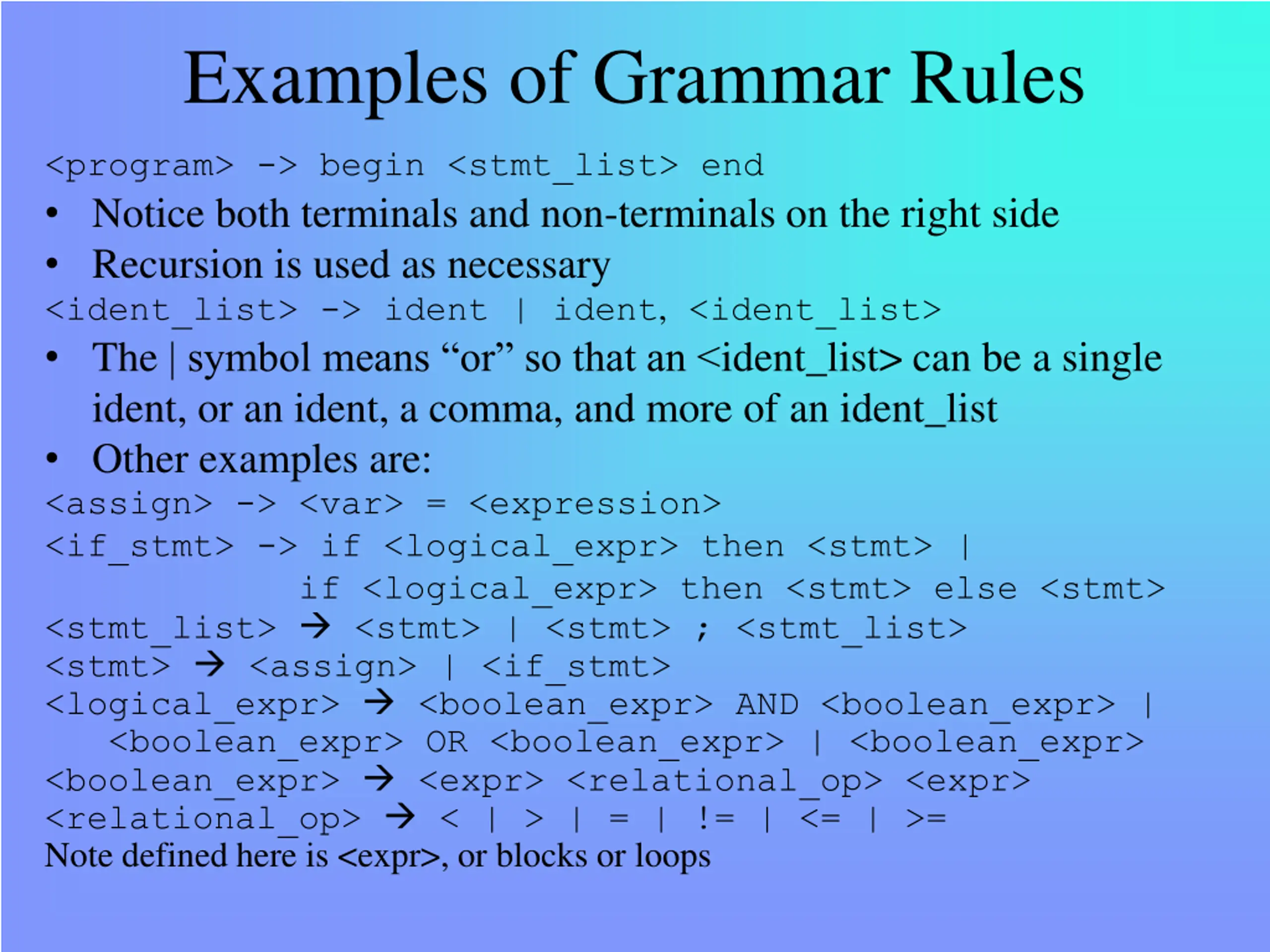Examples of Grammar Rules <program> -> begin <stmt_list> end Notice both terminals and non-terminals on the right side Recursion is used as necessary <ident_list> -> ident | ident, <ident_list> The | symbol means or so that an <ident_list> can be a single ident, or an ident, a comma, and more of an ident_list Other examples are: <assign> -> <var> = <expression> <if_stmt> -> if <logical_expr> then <stmt> | if <logical_expr> then <stmt> else <stmt> <stmt_list> <stmt> | <stmt> ; <stmt_list> <stmt> <assign> | <if_stmt> <logical_expr> <boolean_expr> AND <boolean_expr> | <boolean_expr> OR <boolean_expr> | <boolean_expr> <boolean_expr> <expr> <relational_op> <expr> <relational_op> < | > | = | != | <= | >= Note defined here is <expr>, or blocks or loops