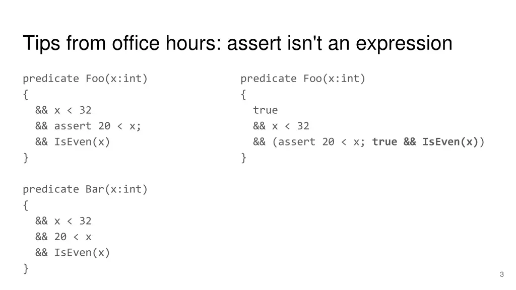 Tips from office hours: assert isn't an expression predicate Foo(x:int) { && x < 32 && assert 20 < x; && IsEven(x) } predicate Foo(x:int) { true && x < 32 && (assert 20 < x; true && IsEven(x)) } predicate Bar(x:int) { && x < 32 && 20 < x && IsEven(x) } 3