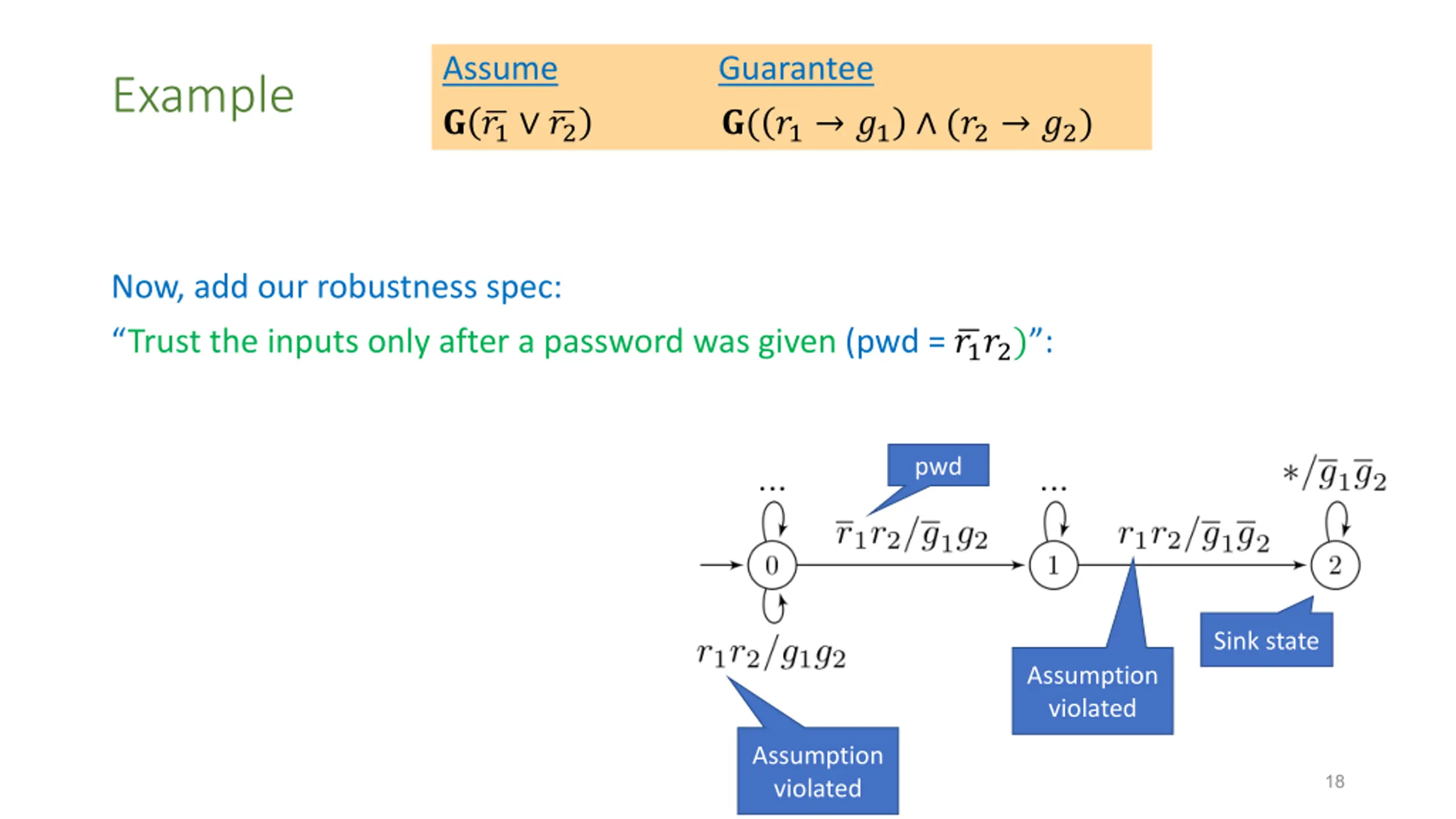 Assume ? ?1 ?2 Guarantee ?( ?1 ?1 (?2 ?2) Example Now, add our robustness spec: Trust the inputs only after a password was given (pwd = ?1?2) : pwd Sink state Assumption violated Assumption violated 18