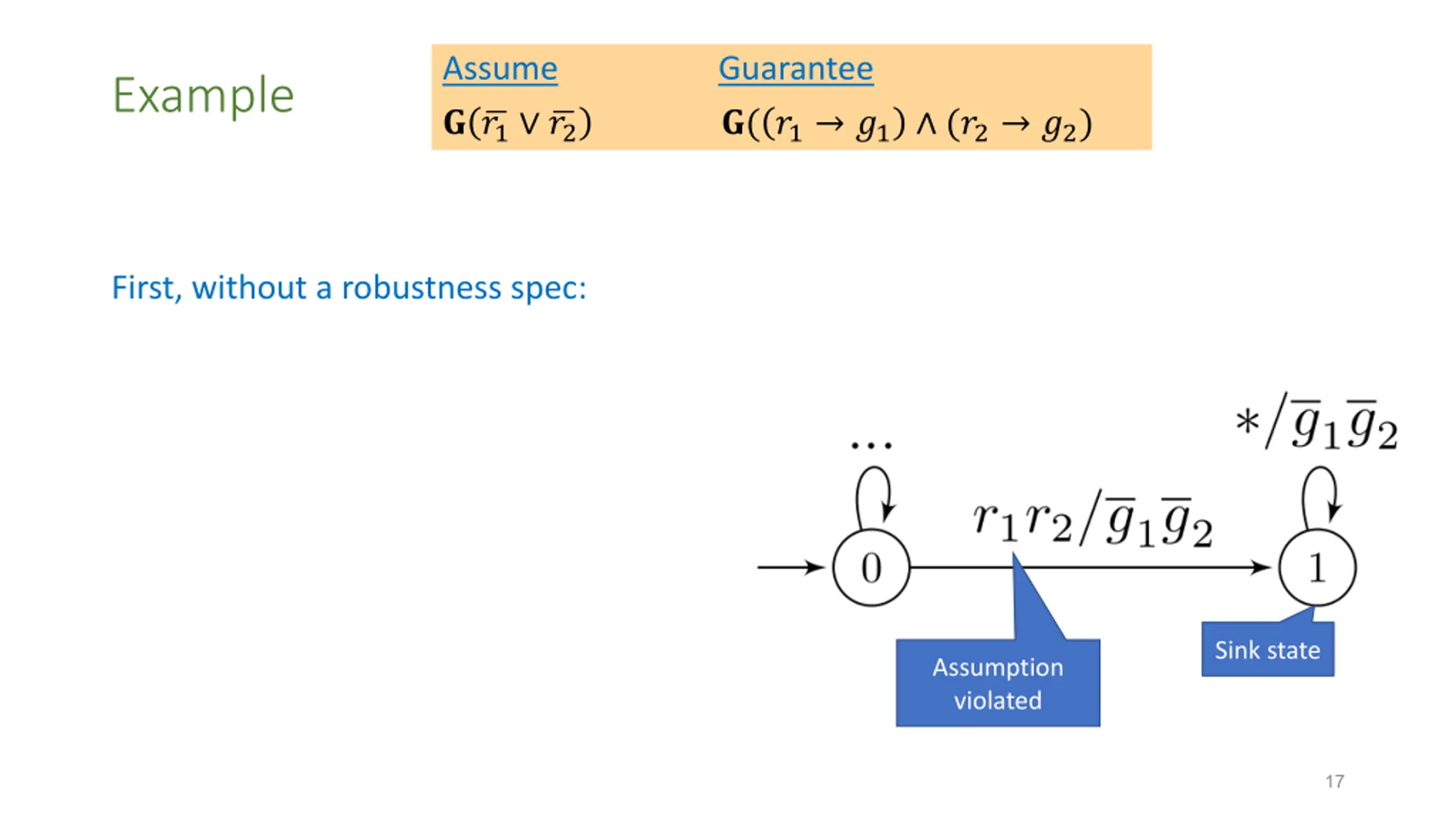 Assume ? ?1 ?2 Guarantee ?( ?1 ?1 (?2 ?2) Example First, without a robustness spec: Sink state Assumption violated 17