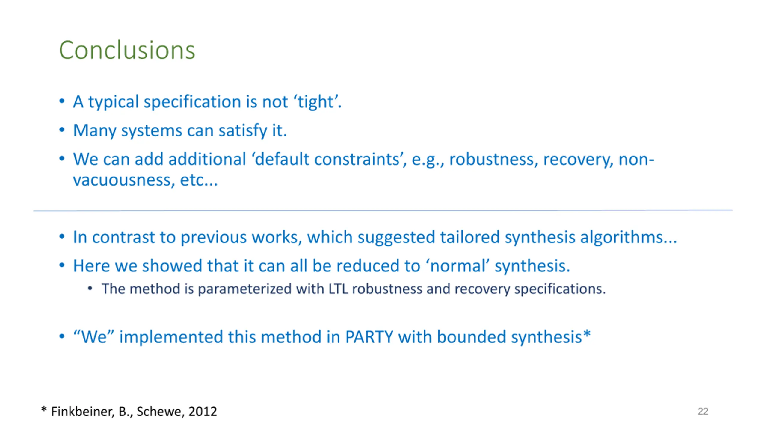 Conclusions A typical specification is not tight . Many systems can satisfy it. We can add additional default constraints , e.g., robustness, recovery, non- vacuousness, etc... In contrast to previous works, which suggested tailored synthesis algorithms... Here we showed that it can all be reduced to normal synthesis. The method is parameterized with LTL robustness and recovery specifications. We implemented this method in PARTY with bounded synthesis* * Finkbeiner, B., Schewe, 2012 22