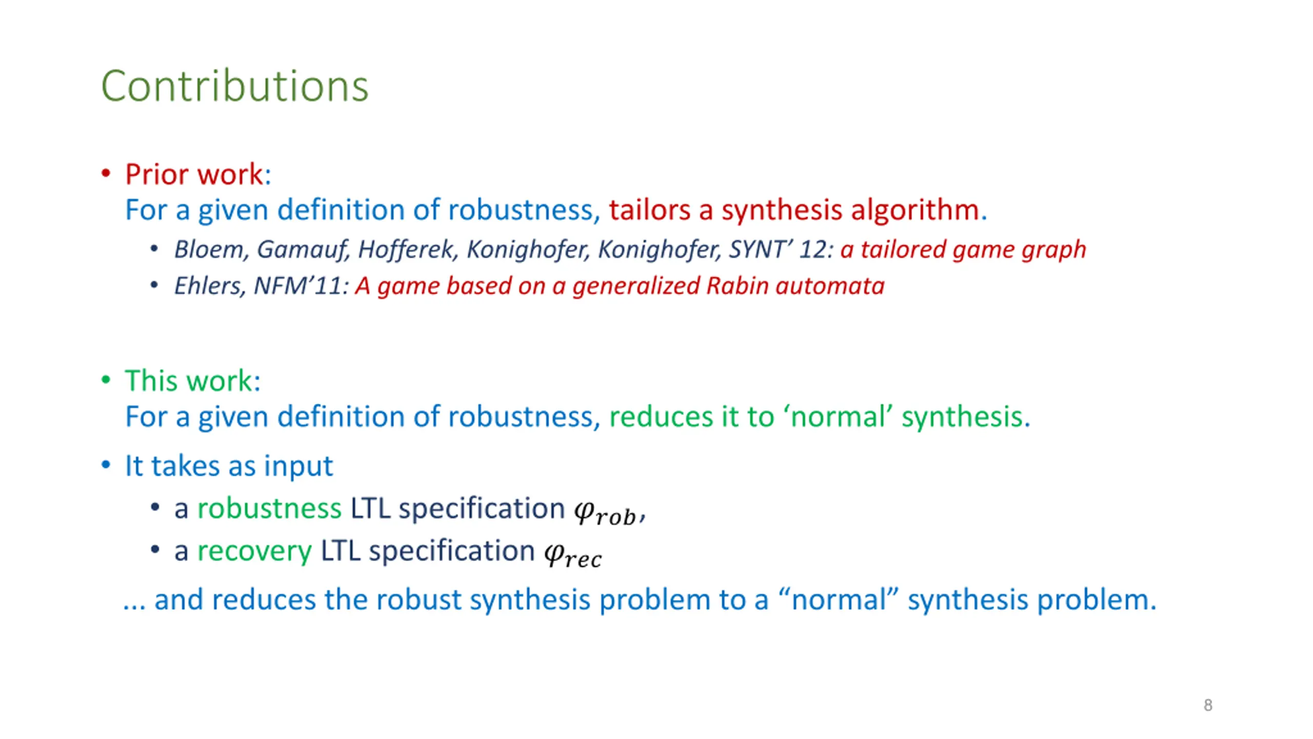 Contributions Prior work: For a given definition of robustness, tailors a synthesis algorithm. Bloem, Gamauf, Hofferek, Konighofer, Konighofer, SYNT 12: a tailored game graph Ehlers, NFM 11: A game based on a generalized Rabin automata This work: For a given definition of robustness, reduces it to normal synthesis. It takes as input a robustness LTL specification ????, a recovery LTL specification ???? ... and reduces the robust synthesis problem to a normal synthesis problem. 8