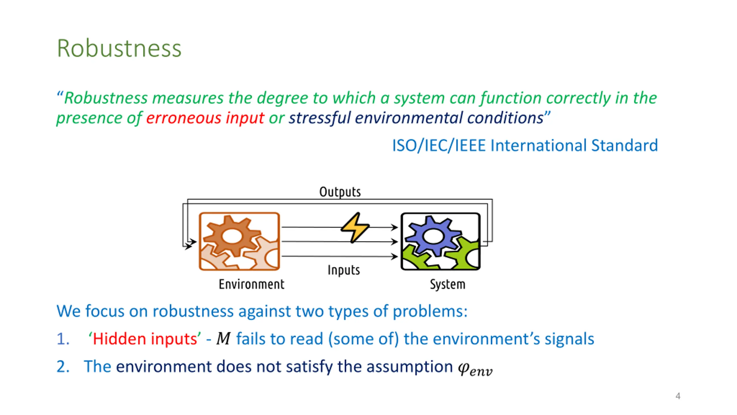 Robustness Robustness measures the degree to which a system can function correctly in the presence of erroneous input or stressful environmental conditions ISO/IEC/IEEE International Standard Outputs Inputs Environment System We focus on robustness against two types of problems: Hidden inputs - ? fails to read (some of) the environment s signals 2. The environment does not satisfy the assumption ???? 1. 4