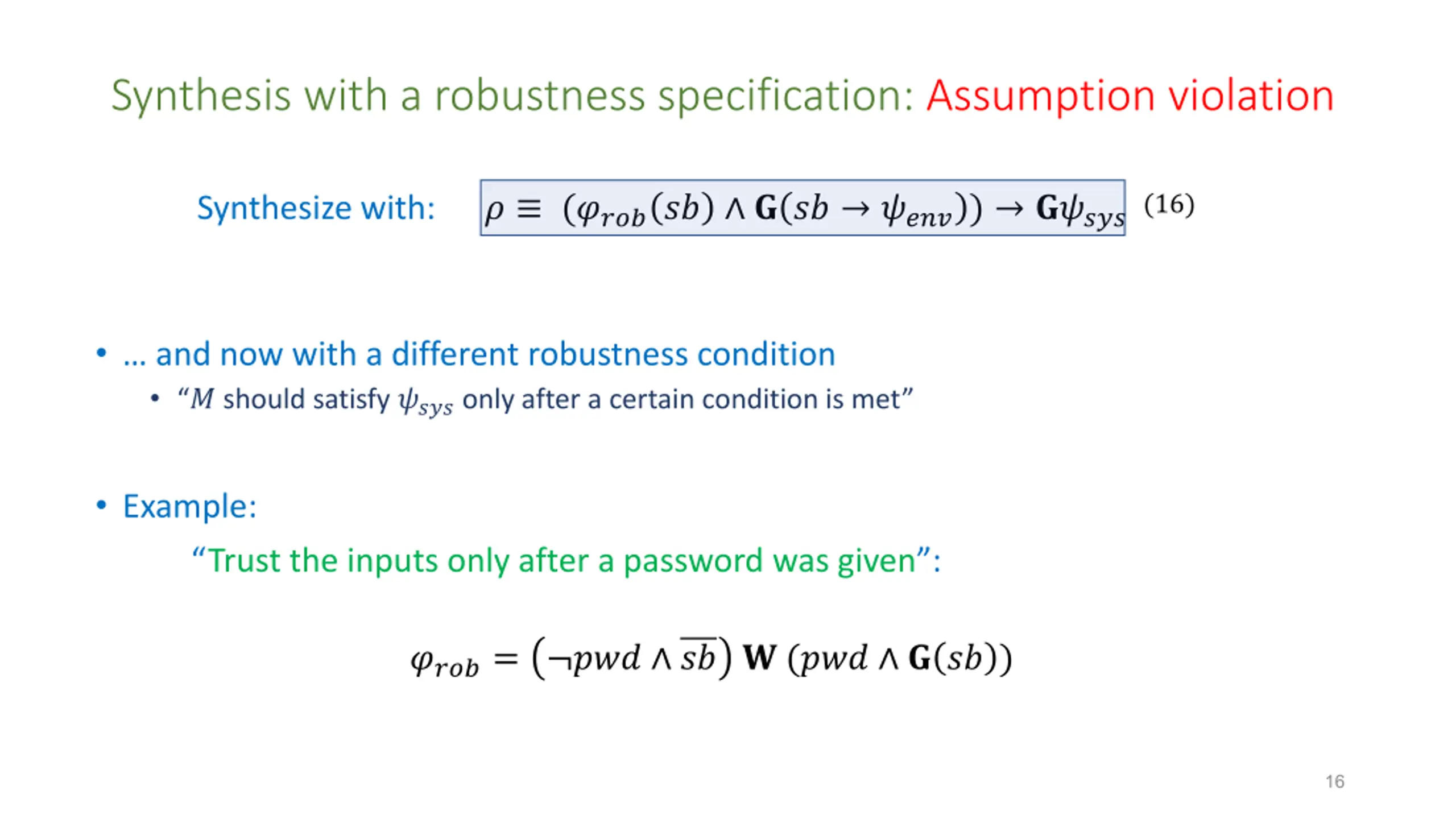 Synthesis with a robustness specification: Assumption violation Synthesize with: ? (?????? ? ?? ????) ????? (16) and now with a different robustness condition ? should satisfy ????only after a certain condition is met Example: Trust the inputs only after a password was given : ????= ??? ?? ? (??? ? ?? ) 16