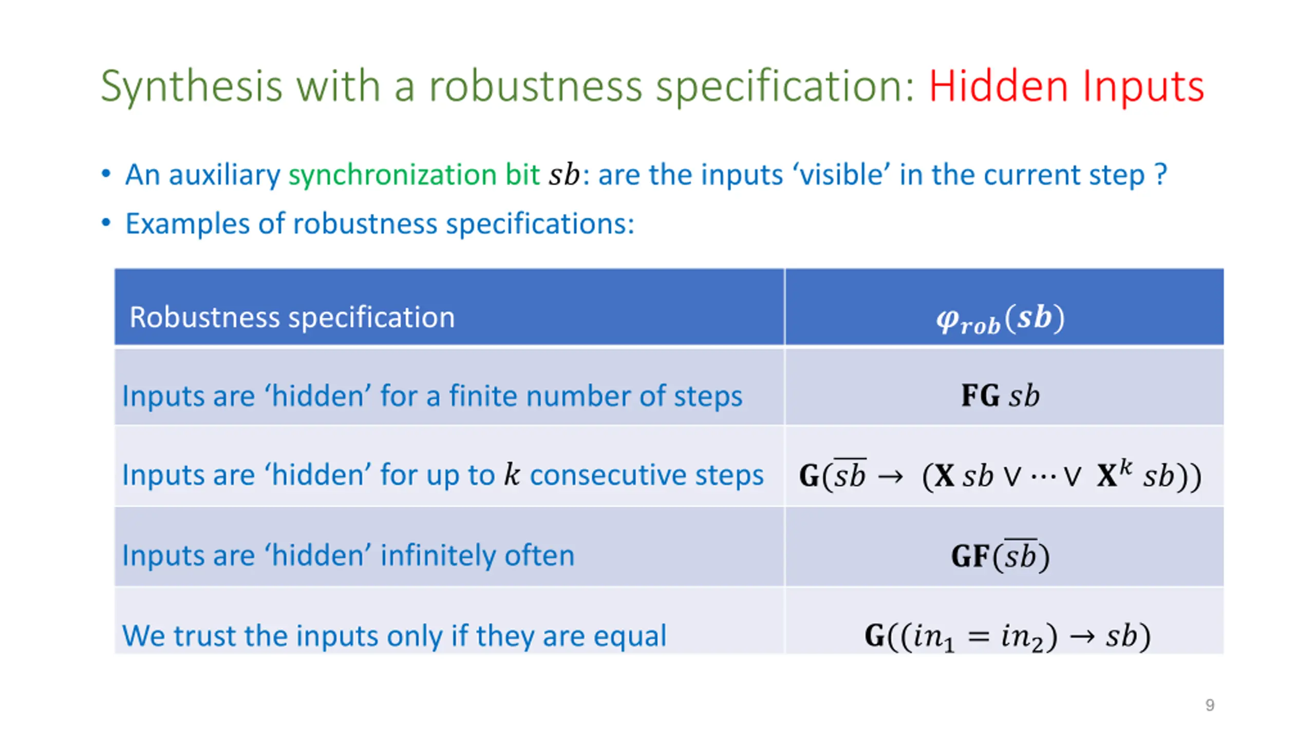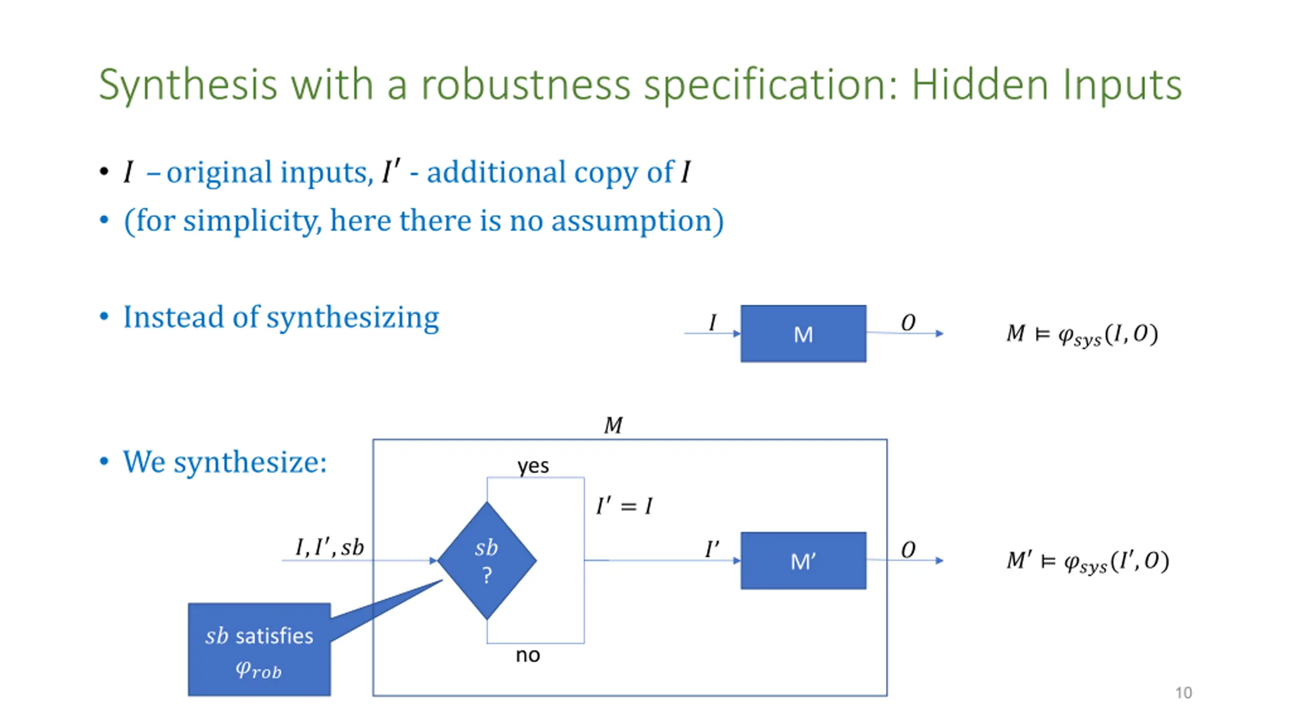 Synthesis with a robustness specification: Hidden Inputs An auxiliary synchronization bit ??: are the inputs visible in the current step ? Examples of robustness specifications: ????(??) Robustness specification ?? ?? Inputs are hidden for a finite number of steps Inputs are hidden for up to ? consecutive steps ?(?? (? ?? ????)) Inputs are hidden infinitely often ??(??) ?((??1= ??2) ??) We trust the inputs only if they are equal 9