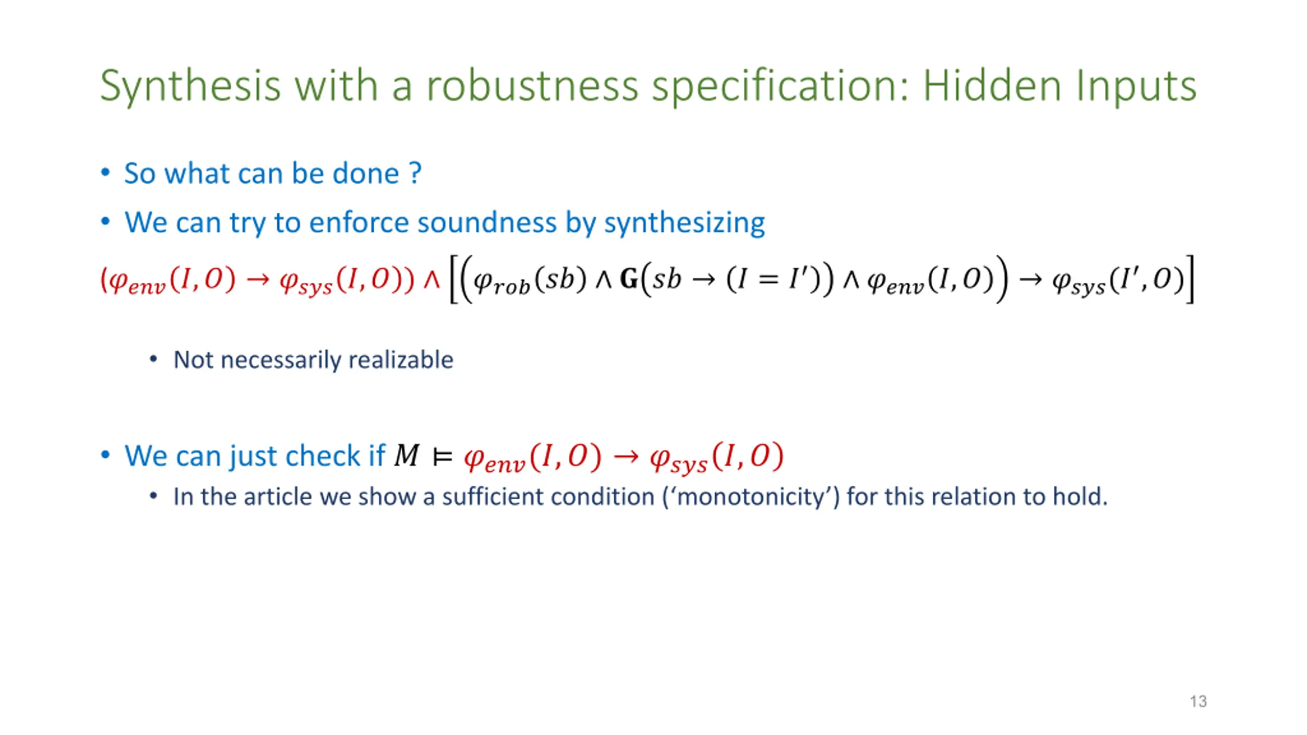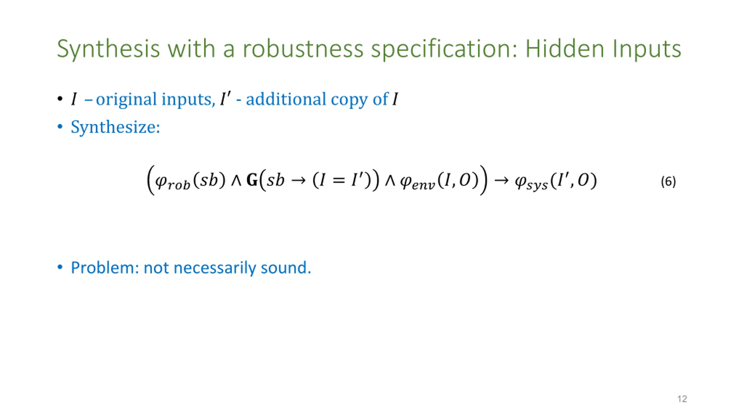 Synthesis with a robustness specification: Hidden Inputs ? original inputs, ? - additional copy of ? Synthesize: ?????? ? ?? ? = ? ????(? ,?) ?????,? (6) Problem: not necessarily sound. 12