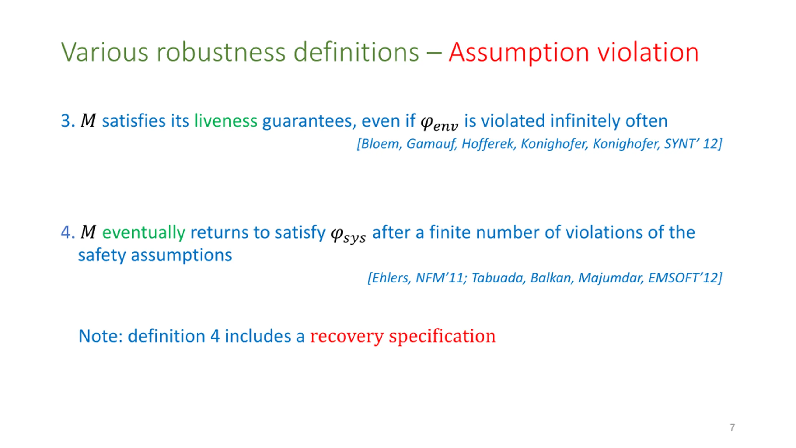 Various robustness definitions Assumption violation 3. ? satisfies its liveness guarantees, even if ????is violated infinitely often [Bloem, Gamauf, Hofferek, Konighofer, Konighofer, SYNT 12] 4. ? eventually returns to satisfy ????after a finite number of violations of the safety assumptions [Ehlers, NFM 11; Tabuada, Balkan, Majumdar, EMSOFT 12] Note: definition 4 includes a recovery specification 7