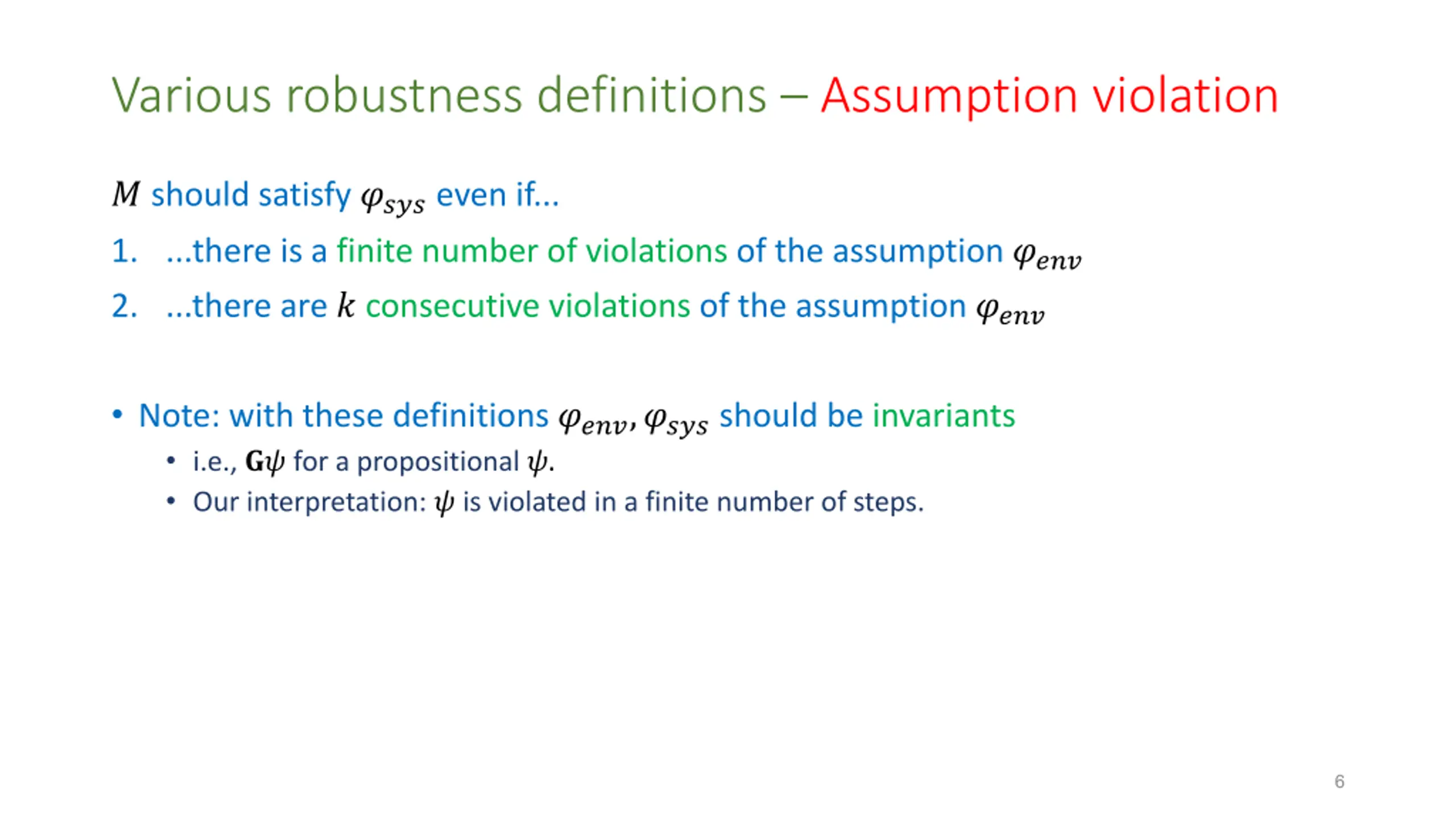 Various robustness definitions Assumption violation ? should satisfy ????even if... 1. ...there is a finite number of violations of the assumption ???? 2. ...there are ? consecutive violations of the assumption ???? Note: with these definitions ????,????should be invariants i.e., ?? for a propositional ?. Our interpretation: ? is violated in a finite number of steps. 6