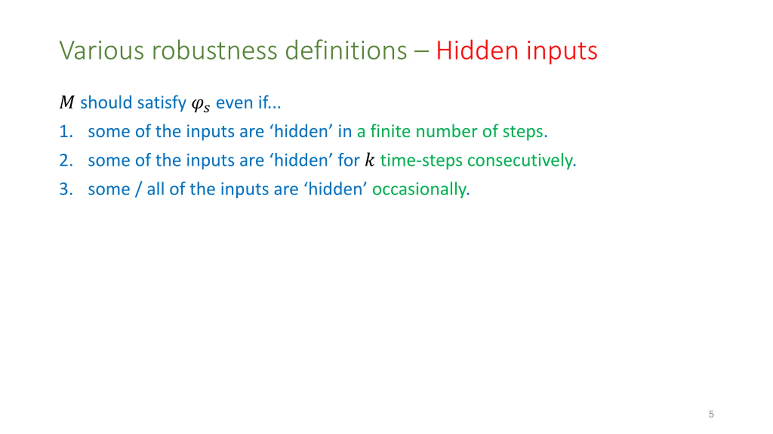Various robustness definitions Hidden inputs ? should satisfy ??even if... 1. some of the inputs are hidden in a finite number of steps. 2. some of the inputs are hidden for ? time-steps consecutively. 3. some / all of the inputs are hidden occasionally. 5