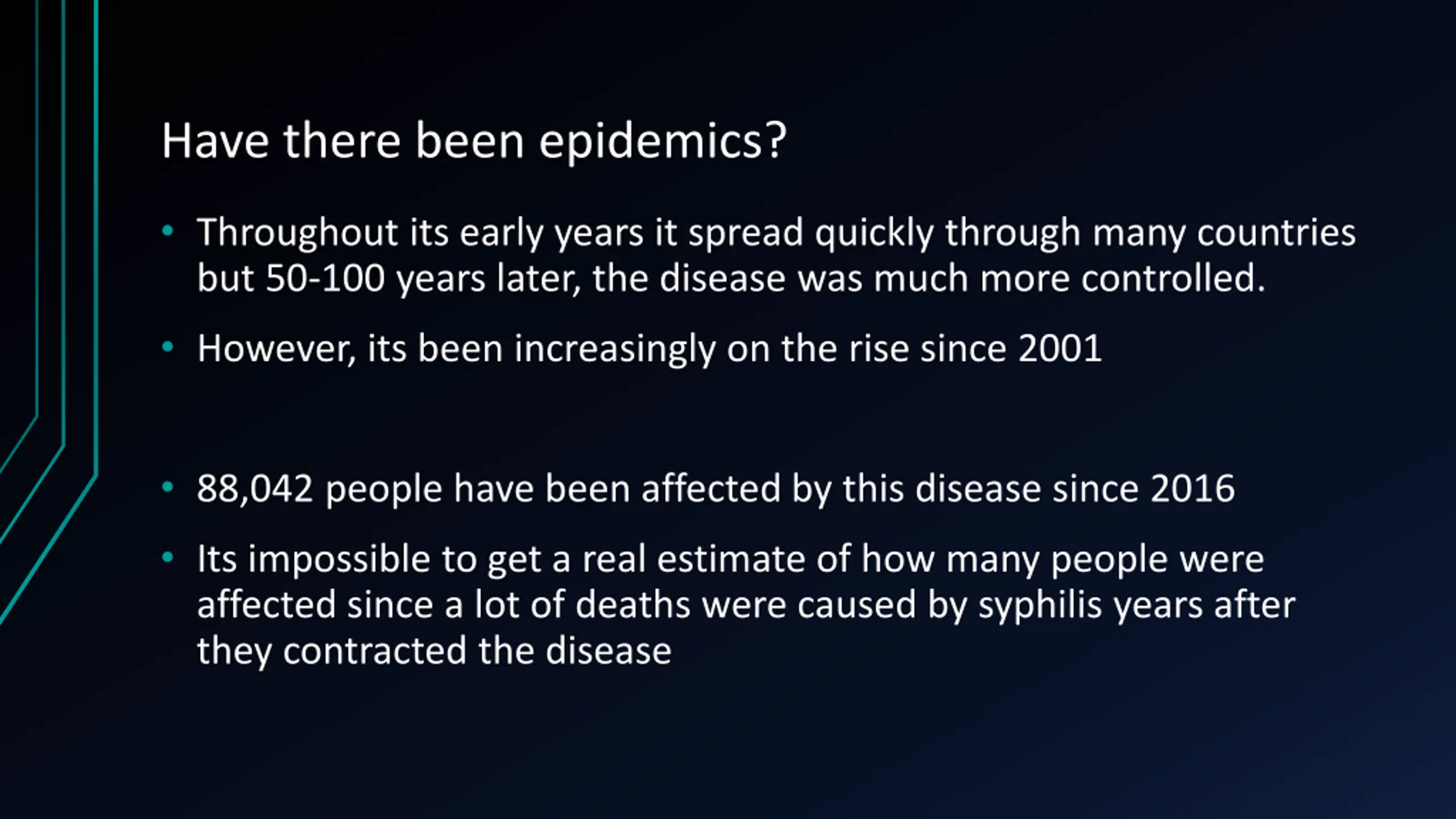 Have there been epidemics? Throughout its early years it spread quickly through many countries but 50-100 years later, the disease was much more controlled. However, its been increasingly on the rise since 2001 88,042 people have been affected by this disease since 2016 Its impossible to get a real estimate of how many people were affected since a lot of deaths were caused by syphilis years after they contracted the disease