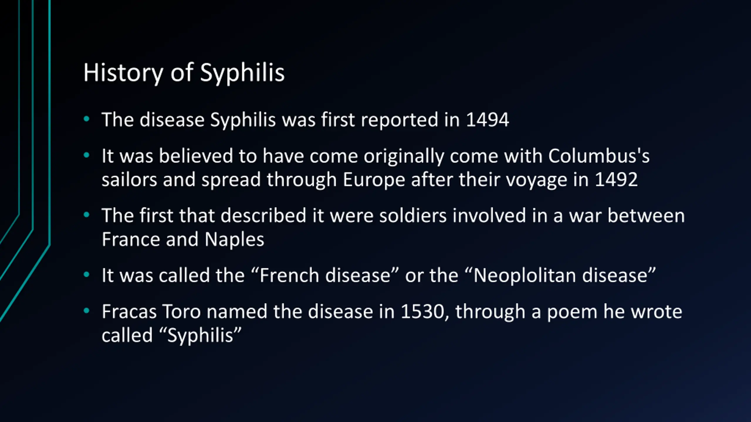History of Syphilis The disease Syphilis was first reported in 1494 It was believed to have come originally come with Columbus's sailors and spread through Europe after their voyage in 1492 The first that described it were soldiers involved in a war between France and Naples It was called the French disease or the Neoplolitan disease Fracas Toro named the disease in 1530, through a poem he wrote called Syphilis