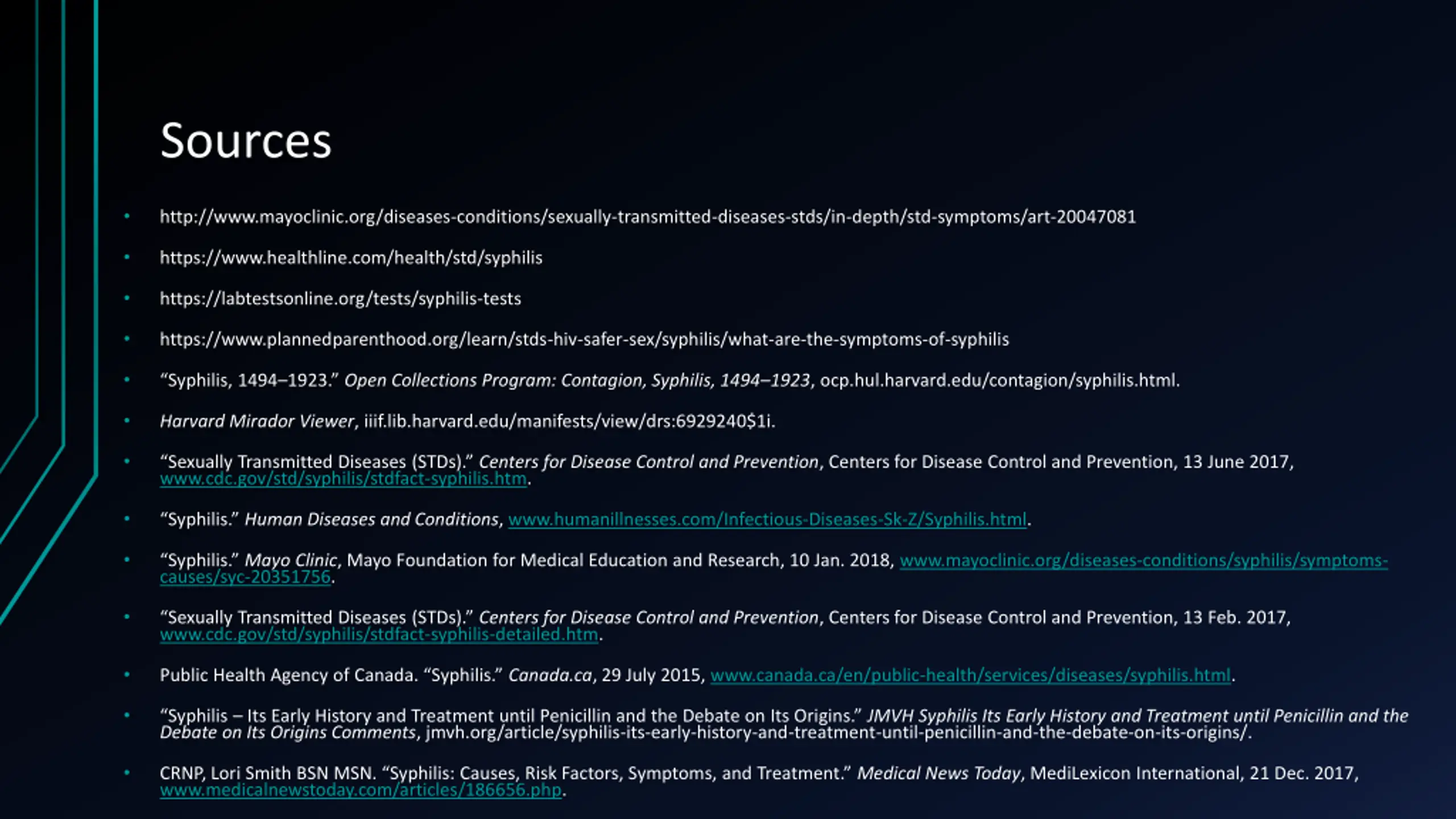 Sources http://www.mayoclinic.org/diseases-conditions/sexually-transmitted-diseases-stds/in-depth/std-symptoms/art-20047081 https://www.healthline.com/health/std/syphilis https://labtestsonline.org/tests/syphilis-tests https://www.plannedparenthood.org/learn/stds-hiv-safer-sex/syphilis/what-are-the-symptoms-of-syphilis Syphilis, 1494 1923. Open Collections Program: Contagion, Syphilis, 1494 1923, ocp.hul.harvard.edu/contagion/syphilis.html. Harvard Mirador Viewer, iiif.lib.harvard.edu/manifests/view/drs:6929240$1i. Sexually Transmitted Diseases (STDs). Centers for Disease Control and Prevention, Centers for Disease Control and Prevention, 13 June 2017, www.cdc.gov/std/syphilis/stdfact-syphilis.htm. Syphilis. Human Diseases and Conditions, www.humanillnesses.com/Infectious-Diseases-Sk-Z/Syphilis.html. Syphilis. Mayo Clinic, Mayo Foundation for Medical Education and Research, 10 Jan. 2018, www.mayoclinic.org/diseases-conditions/syphilis/symptoms- causes/syc-20351756. Sexually Transmitted Diseases (STDs). Centers for Disease Control and Prevention, Centers for Disease Control and Prevention, 13 Feb. 2017, www.cdc.gov/std/syphilis/stdfact-syphilis-detailed.htm. Public Health Agency of Canada. Syphilis. Canada.ca, 29 July 2015, www.canada.ca/en/public-health/services/diseases/syphilis.html. Syphilis Its Early History and Treatment until Penicillin and the Debate on Its Origins. JMVH Syphilis Its Early History and Treatment until Penicillin and the Debate on Its Origins Comments, jmvh.org/article/syphilis-its-early-history-and-treatment-until-penicillin-and-the-debate-on-its-origins/. CRNP, Lori Smith BSN MSN. Syphilis: Causes, Risk Factors, Symptoms, and Treatment. Medical News Today, MediLexicon International, 21 Dec. 2017, www.medicalnewstoday.com/articles/186656.php.