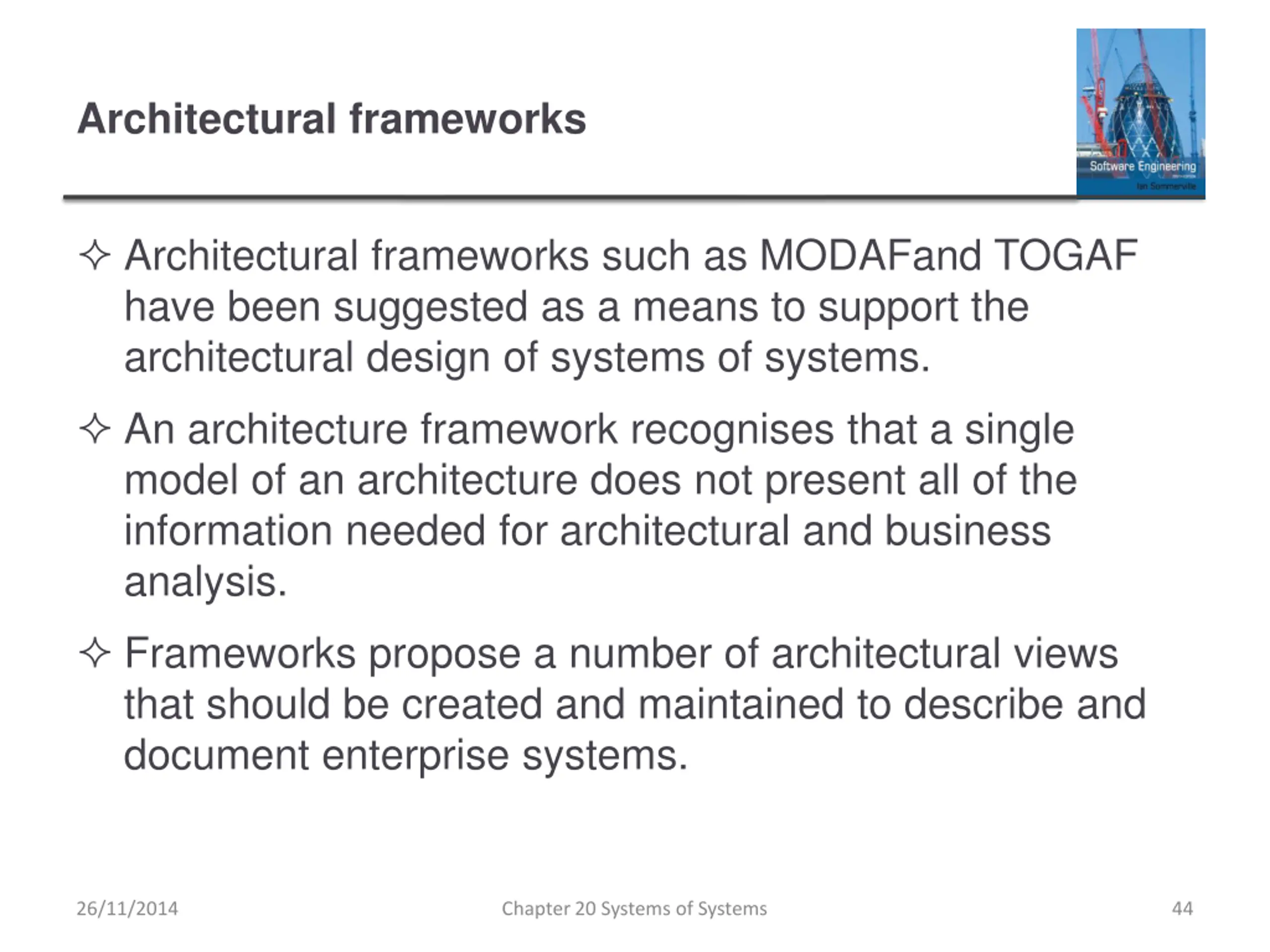 Architectural frameworks Architectural frameworks such as MODAFand TOGAF have been suggested as a means to support the architectural design of systems of systems. An architecture framework recognises that a single model of an architecture does not present all of the information needed for architectural and business analysis. Frameworks propose a number of architectural views that should be created and maintained to describe and document enterprise systems. 26/11/2014 Chapter 20 Systems of Systems 44