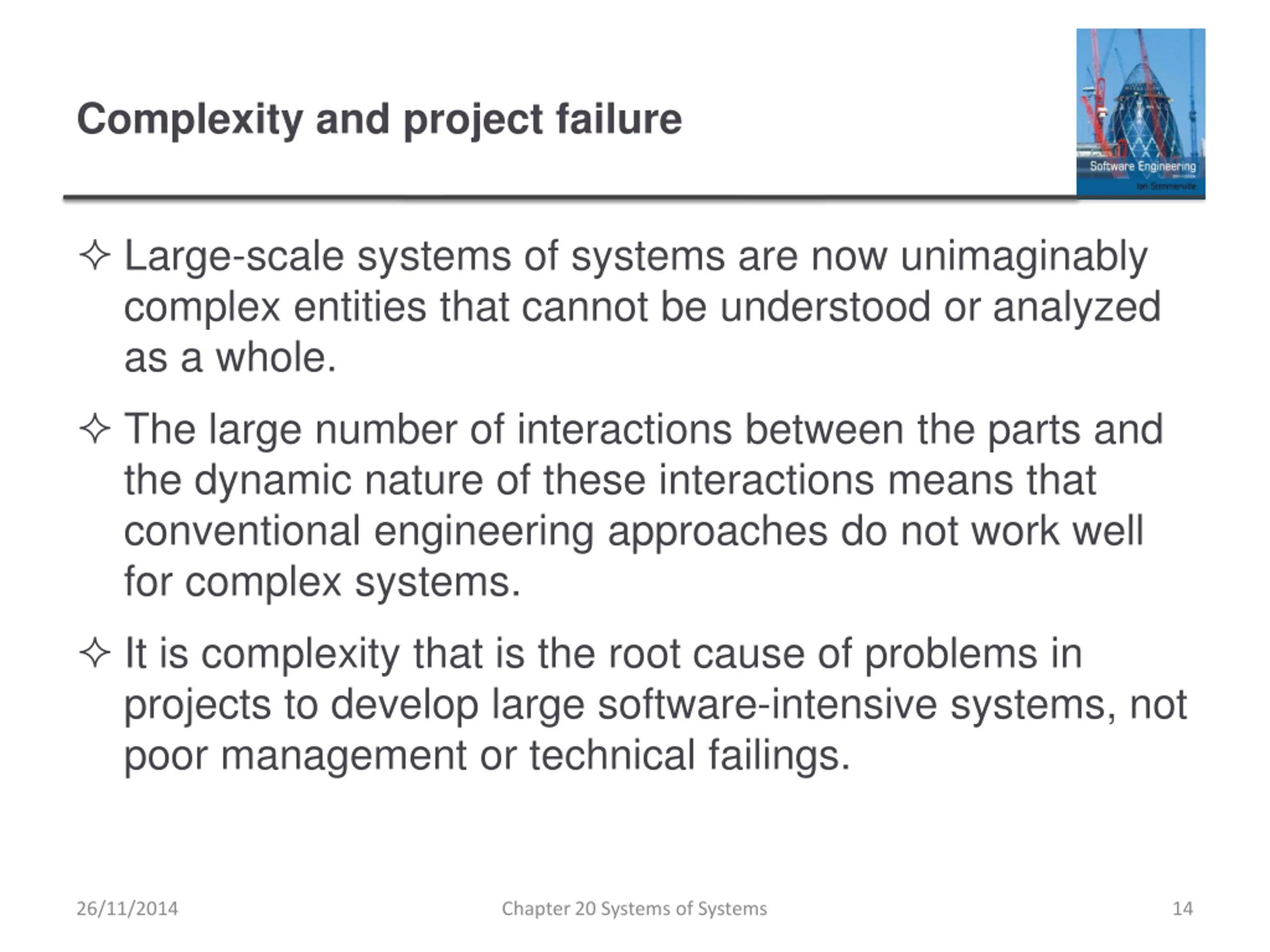 Complexity and project failure Large-scale systems of systems are now unimaginably complex entities that cannot be understood or analyzed as a whole. The large number of interactions between the parts and the dynamic nature of these interactions means that conventional engineering approaches do not work well for complex systems. It is complexity that is the root cause of problems in projects to develop large software-intensive systems, not poor management or technical failings. 26/11/2014 Chapter 20 Systems of Systems 14