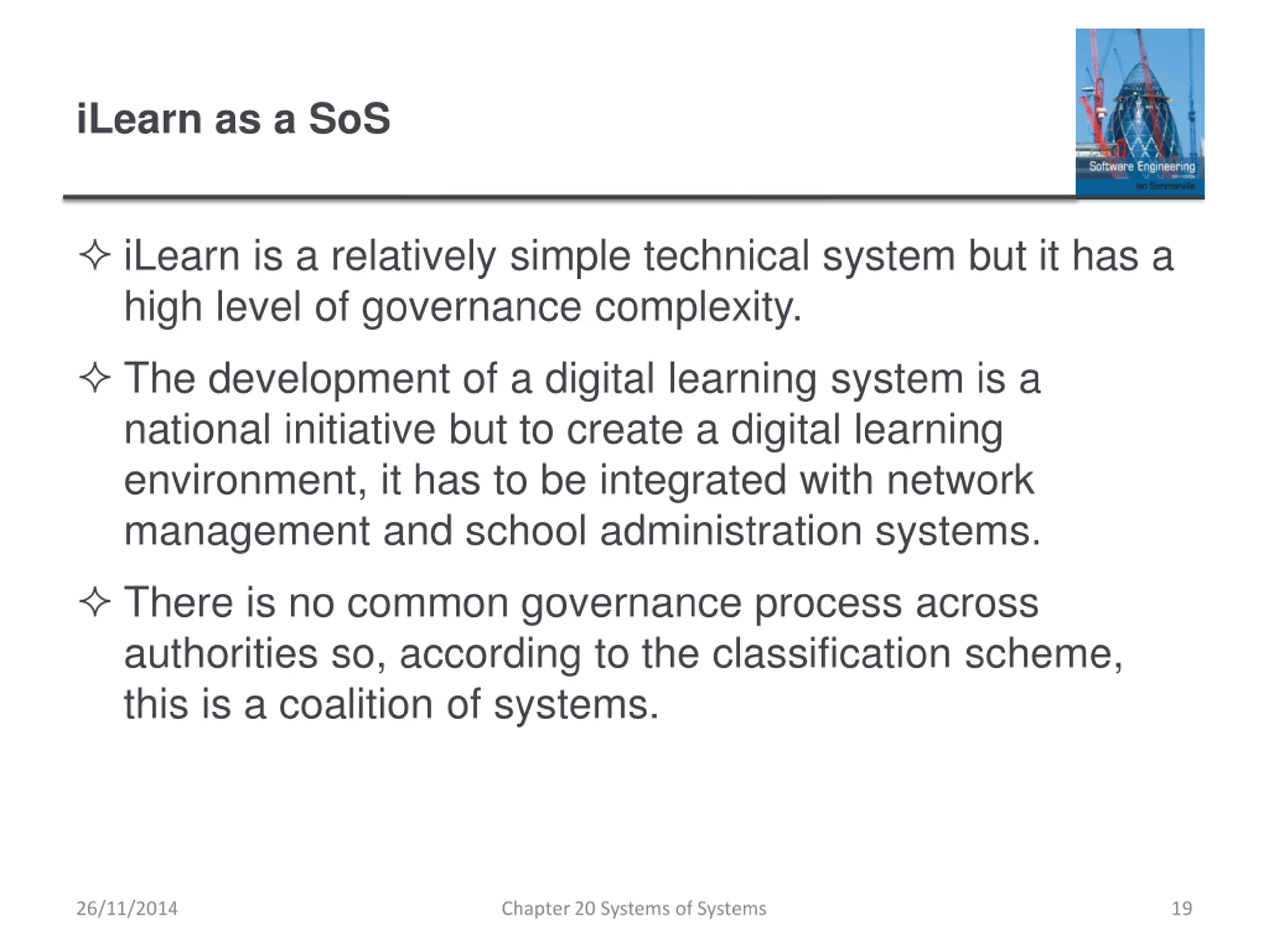 iLearn as a SoS iLearn is a relatively simple technical system but it has a high level of governance complexity. The development of a digital learning system is a national initiative but to create a digital learning environment, it has to be integrated with network management and school administration systems. There is no common governance process across authorities so, according to the classification scheme, this is a coalition of systems. 26/11/2014 Chapter 20 Systems of Systems 19