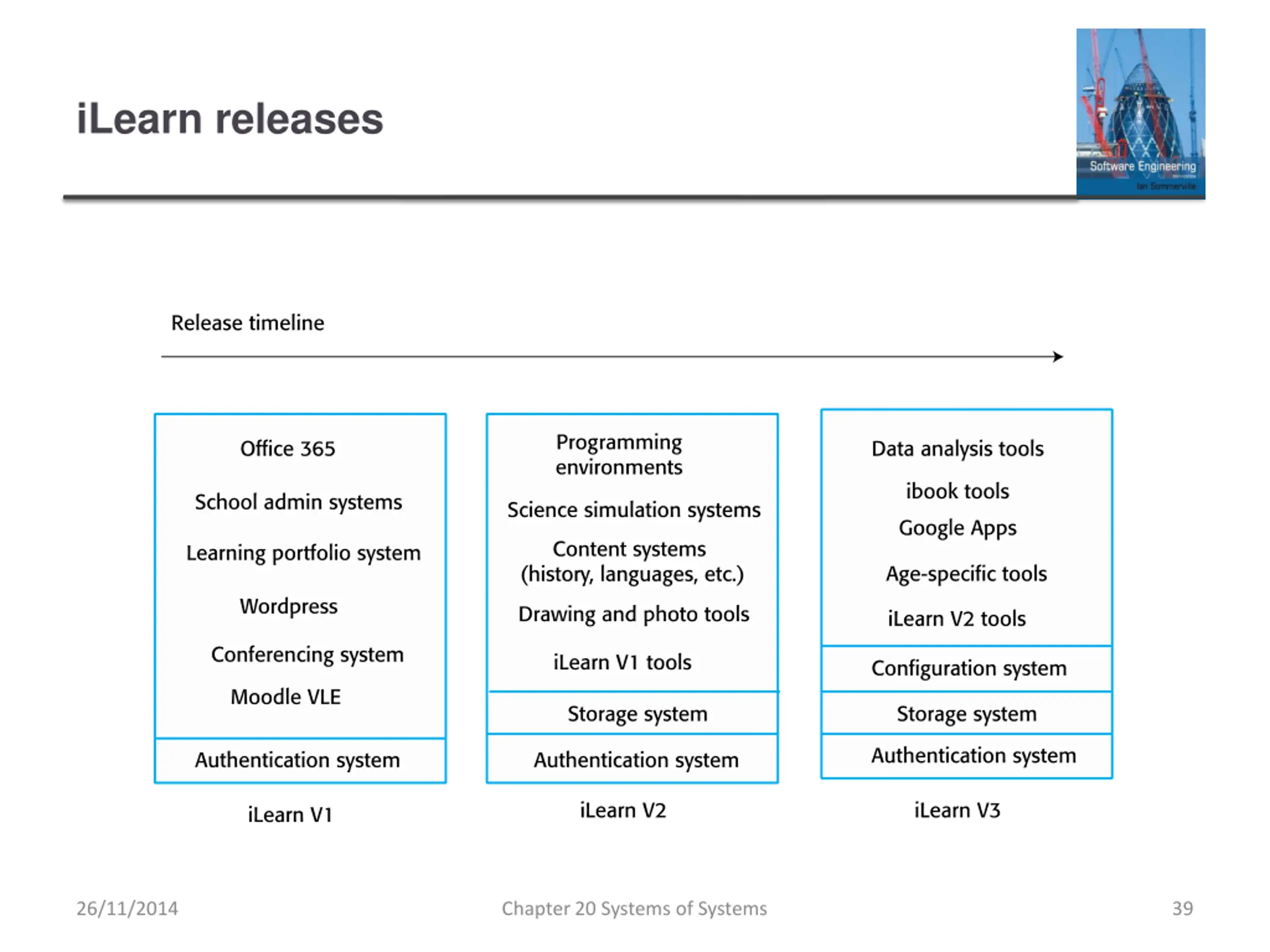 Staged deployment of the iLearn system The initial deployment provides authentication, basic learning functionality and integration with school administration systems. Stage 2 adds an integrated storage system and a set of more specialized tools to support subject-specific learning. Stage 3 adds features for user configuration and the ability for users to add new systems to the iLearn environment. 26/11/2014 Chapter 20 Systems of Systems 38