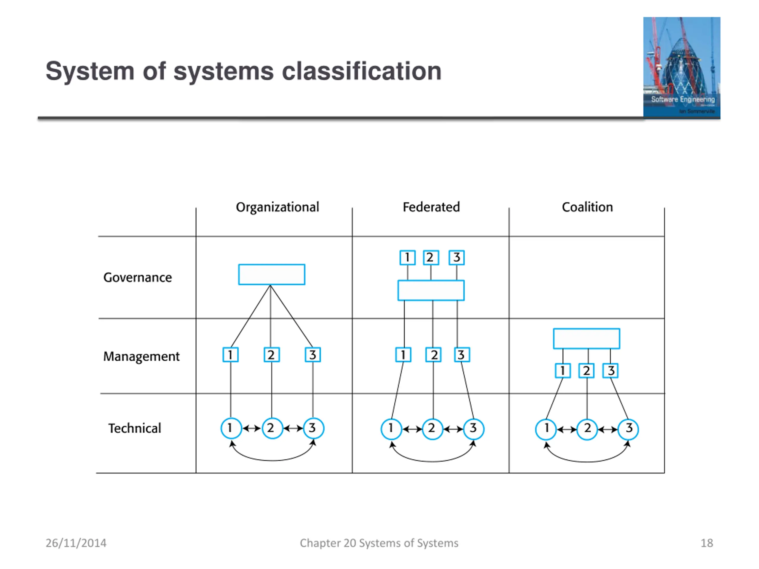 More intuitive classification terms Organizational systems of systems are SoS where the governance and management of the system lies within the same organization or company. Federated systems are SoS where the governance of the SoS depends on a voluntary participative body in which all of the system owners are represented. System of system coalitions are SoS where there are no formal governance mechanisms but where the organizations involved informally collaborate and manage their own systems to maintain the system as a whole. 26/11/2014 Chapter 20 Systems of Systems 17