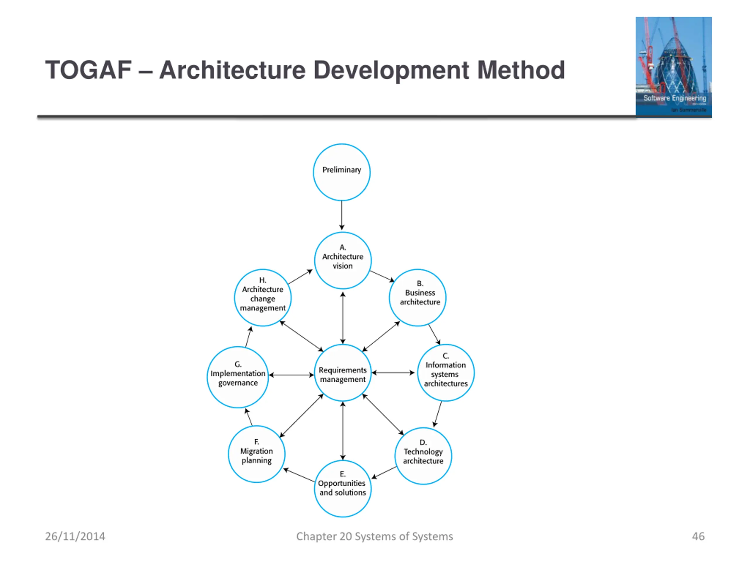 TOGAF The TOGAF framework has been developed by the Open Group as an open standard and is intended to support the design of a business architecture, a data architecture, an application architecture and a technology architecture for an enterprise. At its heart is the Architecture Development Method (ADM), which consists of a number of discrete phases. 26/11/2014 Chapter 20 Systems of Systems 45