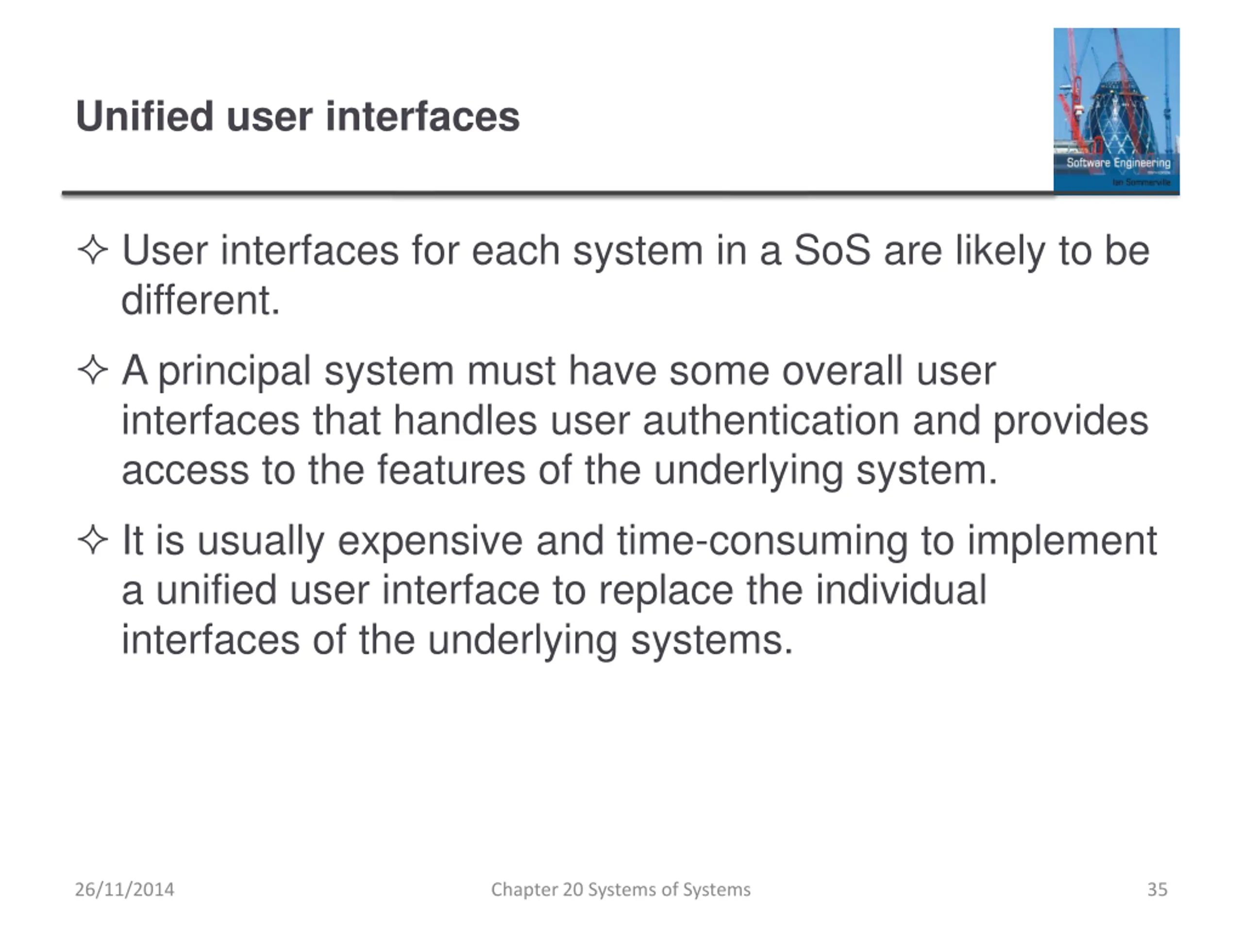 Unified user interfaces User interfaces for each system in a SoS are likely to be different. A principal system must have some overall user interfaces that handles user authentication and provides access to the features of the underlying system. It is usually expensive and time-consuming to implement a unified user interface to replace the individual interfaces of the underlying systems. 26/11/2014 Chapter 20 Systems of Systems 35