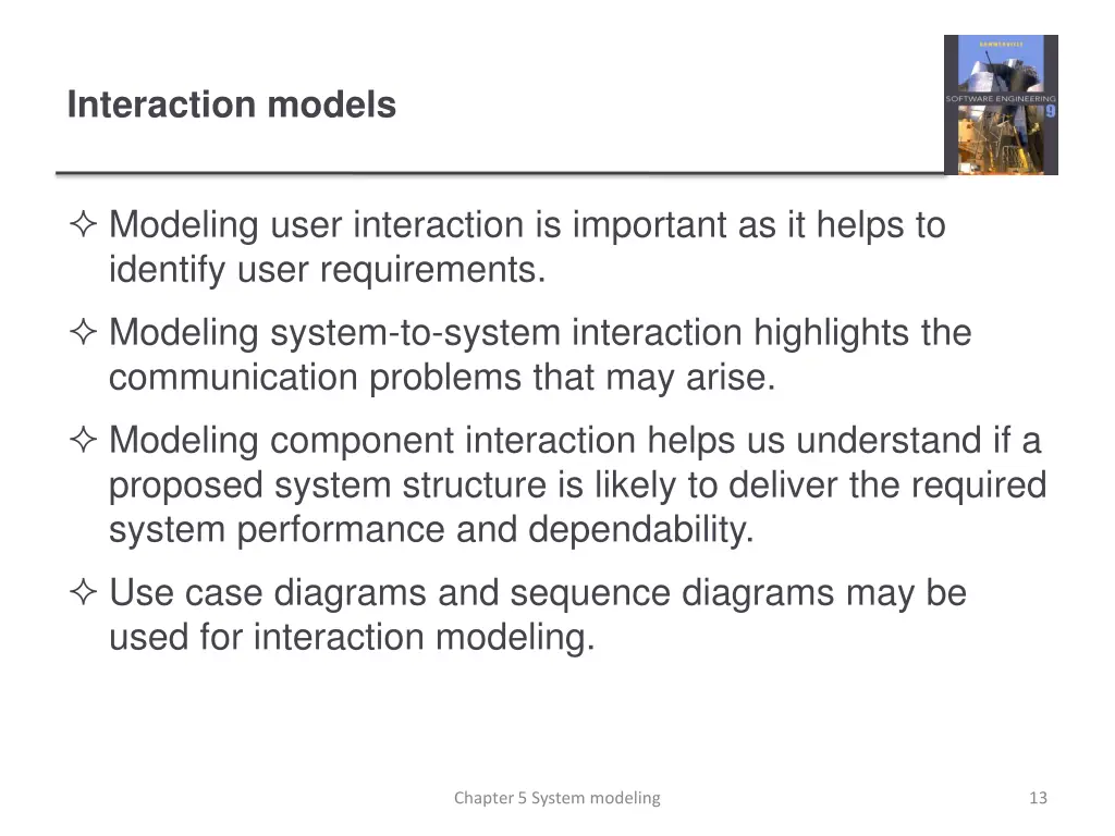 Interaction models Modeling user interaction is important as it helps to identify user requirements. Modeling system-to-system interaction highlights the communication problems that may arise. Modeling component interaction helps us understand if a proposed system structure is likely to deliver the required system performance and dependability. Use case diagrams and sequence diagrams may be used for interaction modeling. Chapter 5 System modeling 13