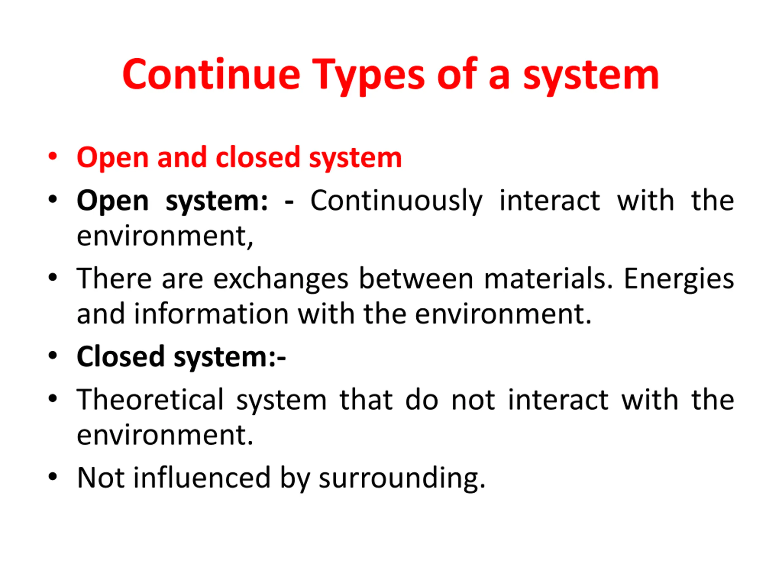 Continue Types of a system Open and closed system Open system: - Continuously interact with the environment, There are exchanges between materials. Energies and information with the environment. Closed system:- Theoretical system that do not interact with the environment. Not influenced by surrounding.