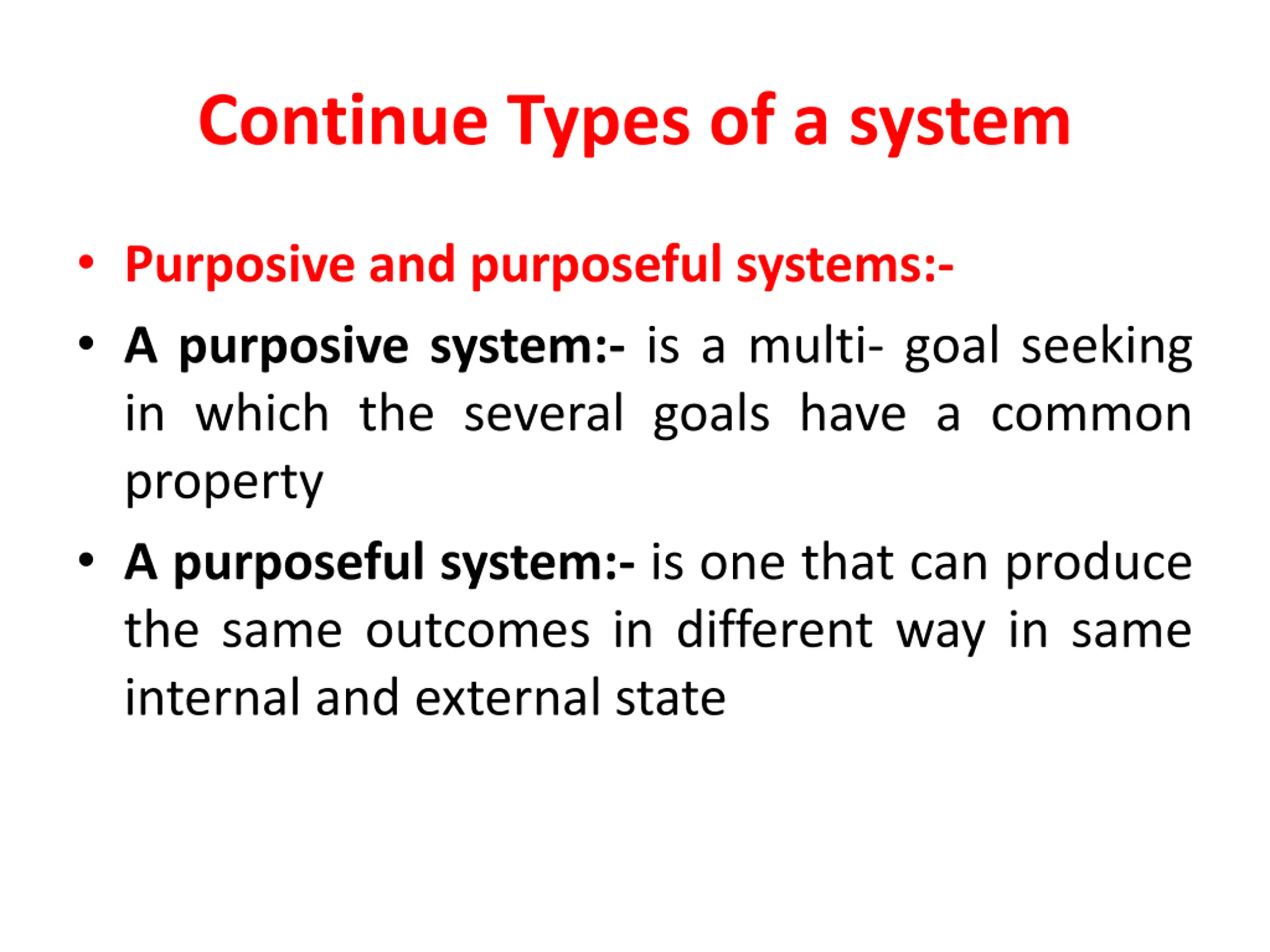 Continue Types of a system Purposive and purposeful systems:- A purposive system:- is a multi- goal seeking in which the several goals have a common property A purposeful system:- is one that can produce the same outcomes in different way in same internal and external state