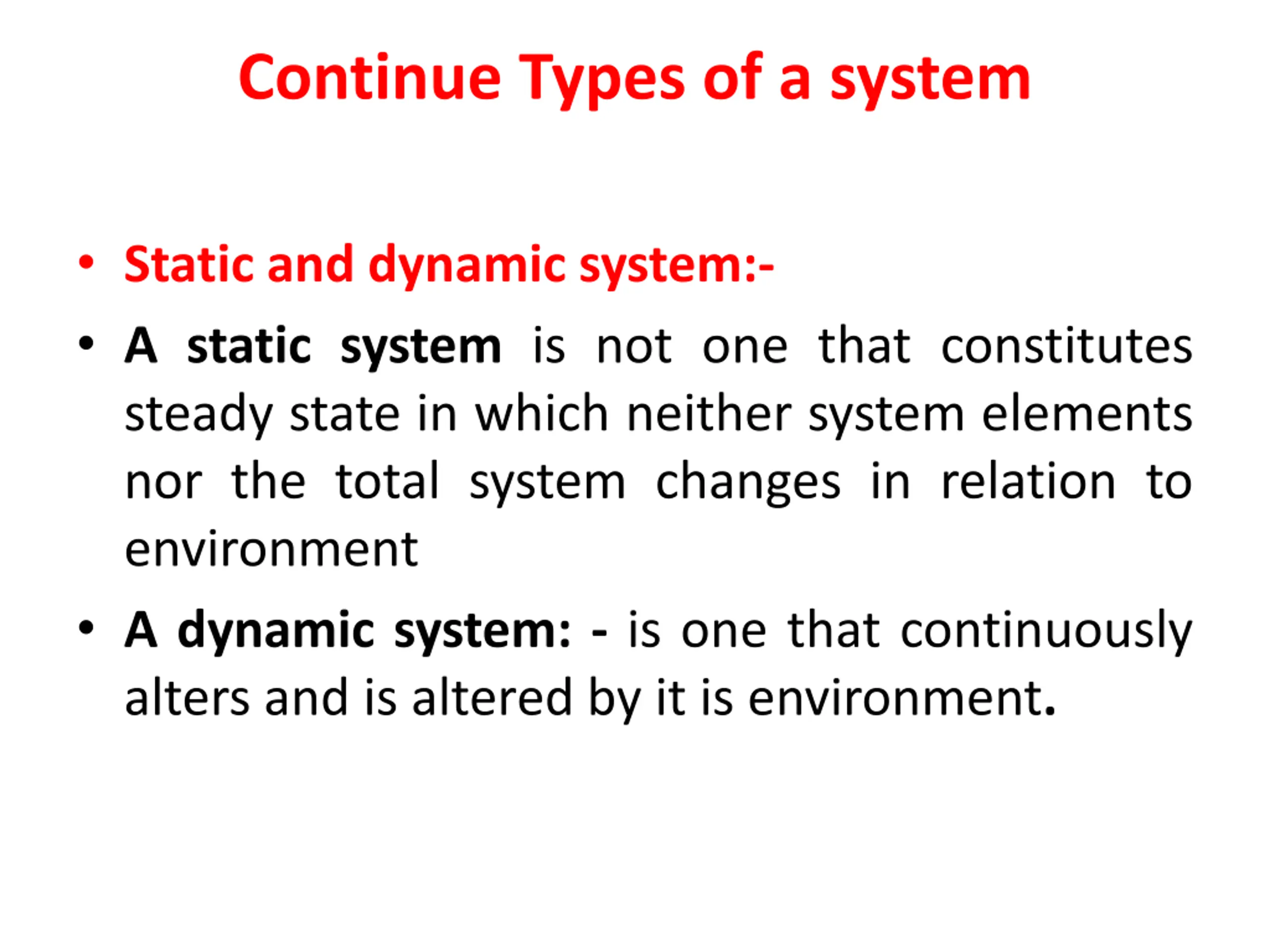 Continue Types of a system Static and dynamic system:- A static system is not one that constitutes steady state in which neither system elements nor the total system changes in relation to environment A dynamic system: - is one that continuously alters and is altered by it is environment.
