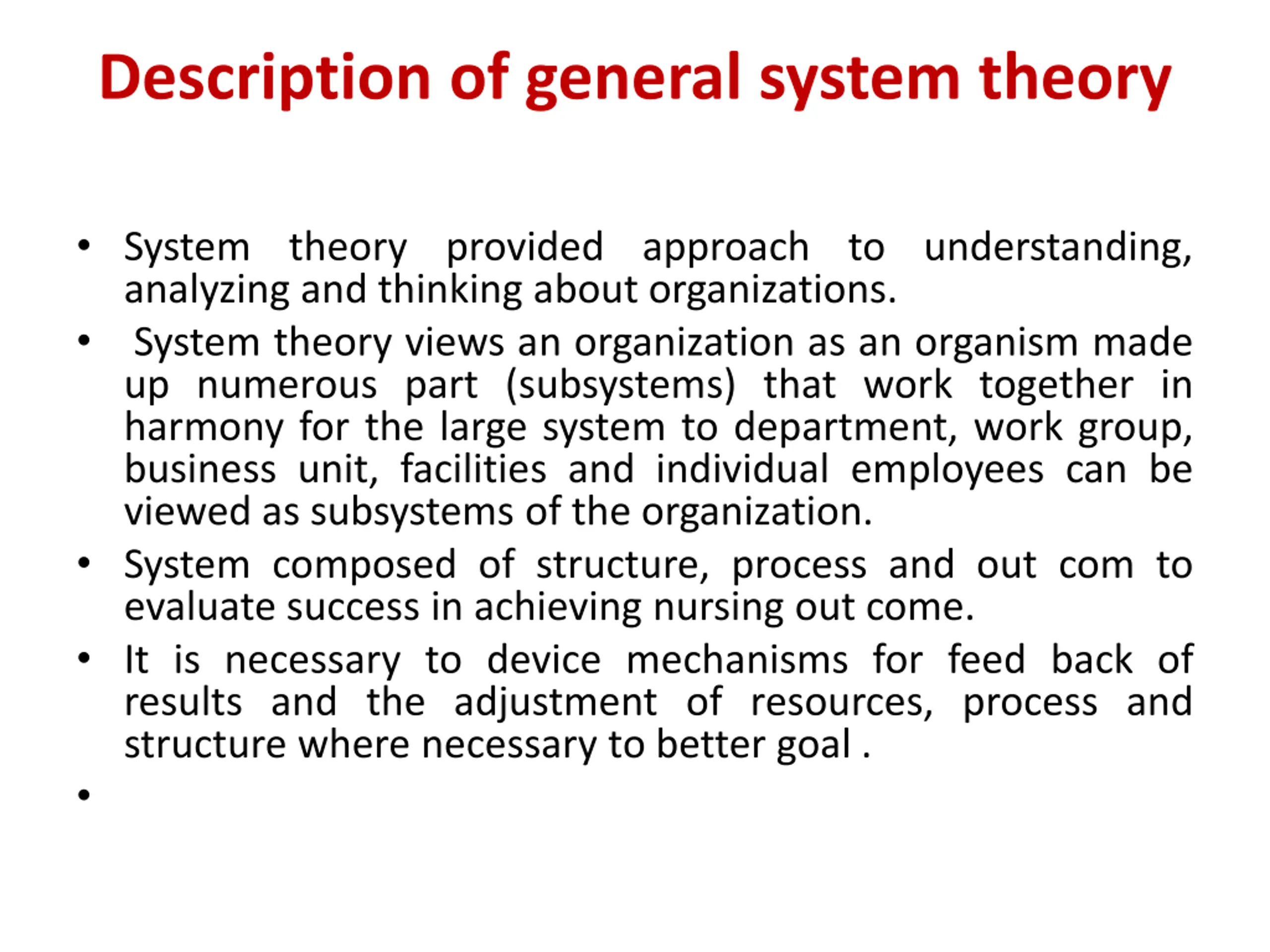 Description of general system theory System theory provided approach to understanding, analyzing and thinking about organizations. System theory views an organization as an organism made up numerous part (subsystems) that work together in harmony for the large system to department, work group, business unit, facilities and individual employees can be viewed as subsystems of the organization. System composed of structure, process and out com to evaluate success in achieving nursing out come. It is necessary to device mechanisms for feed back of results and the adjustment of resources, process and structure where necessary to better goal .