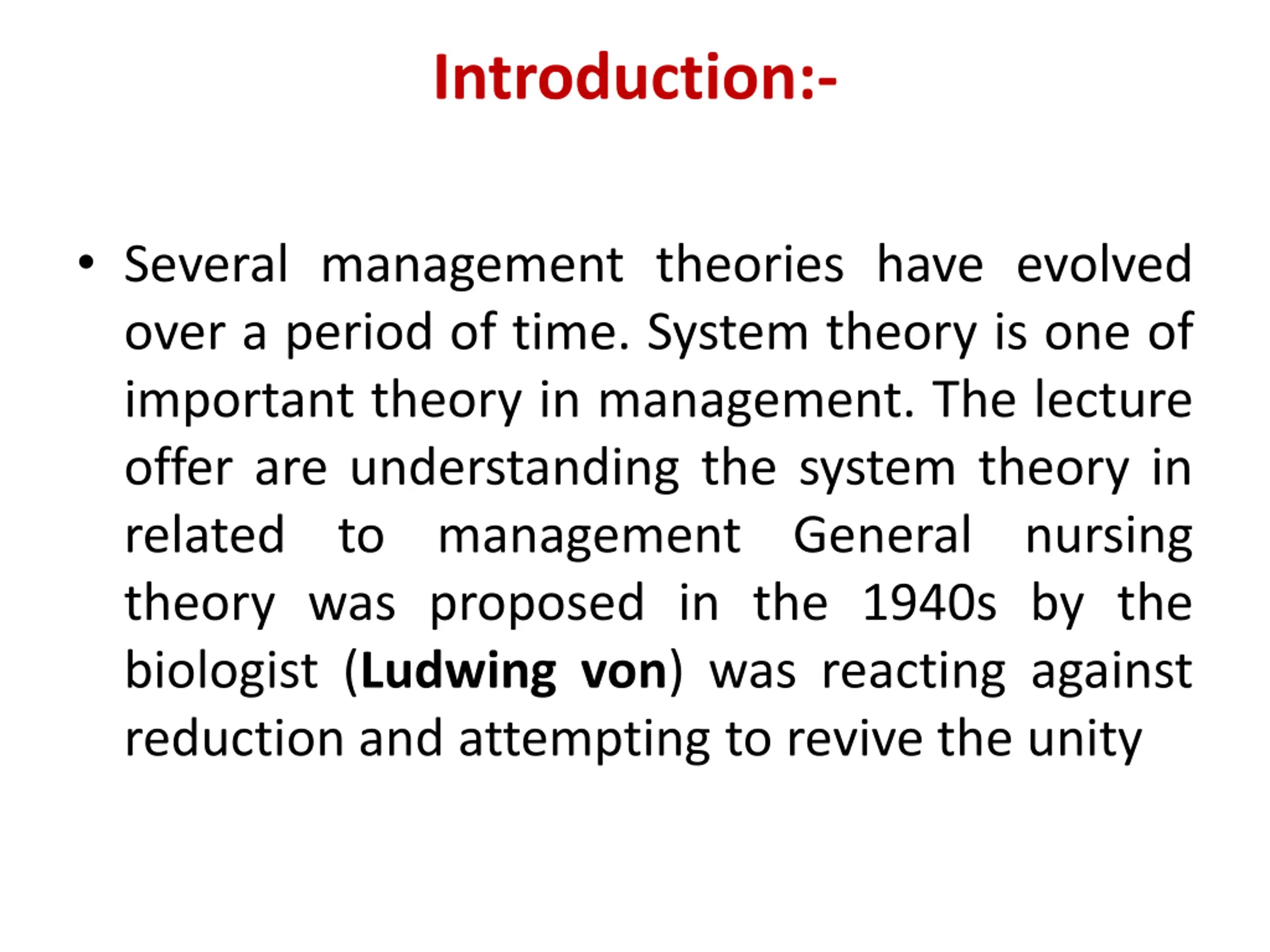 Introduction:- Several management theories have evolved over a period of time. System theory is one of important theory in management. The lecture offer are understanding the system theory in related to management theory was proposed in the 1940s by the biologist (Ludwing von) was reacting against reduction and attempting to revive the unity General nursing